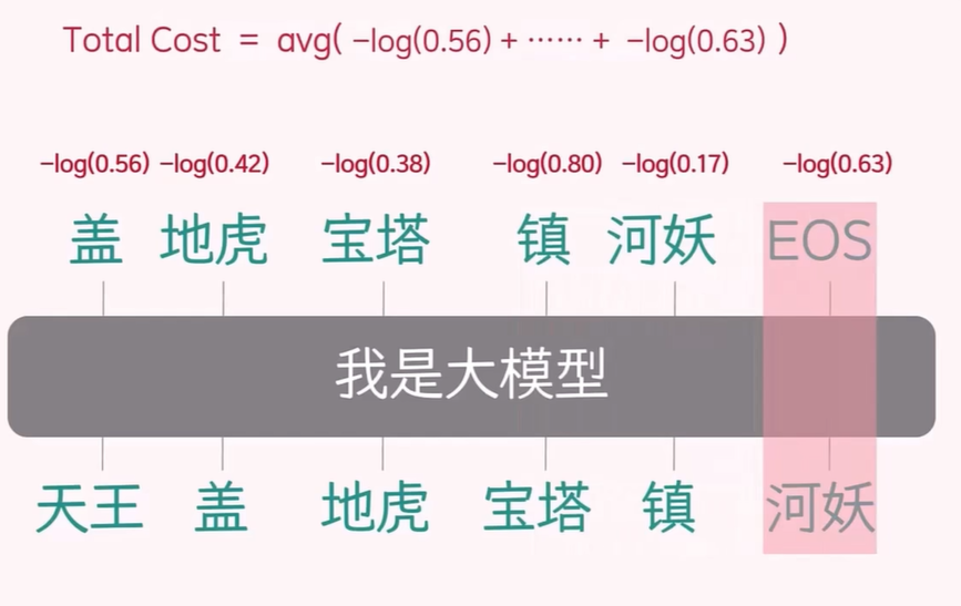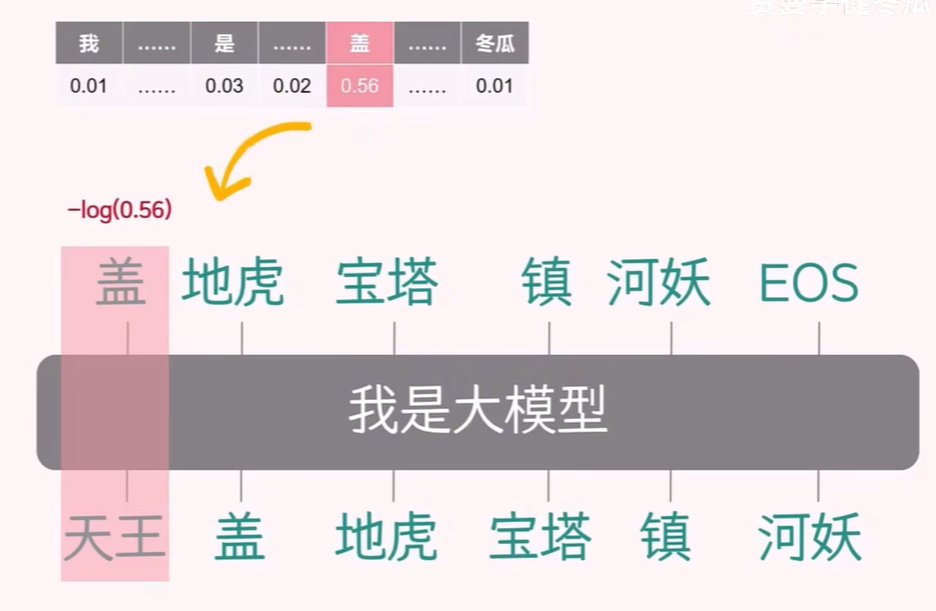 在训练阶段,对于 token “天王” 对应的真实 next token “盖”,在经过 softmax 计算得到的候选词概率,使用