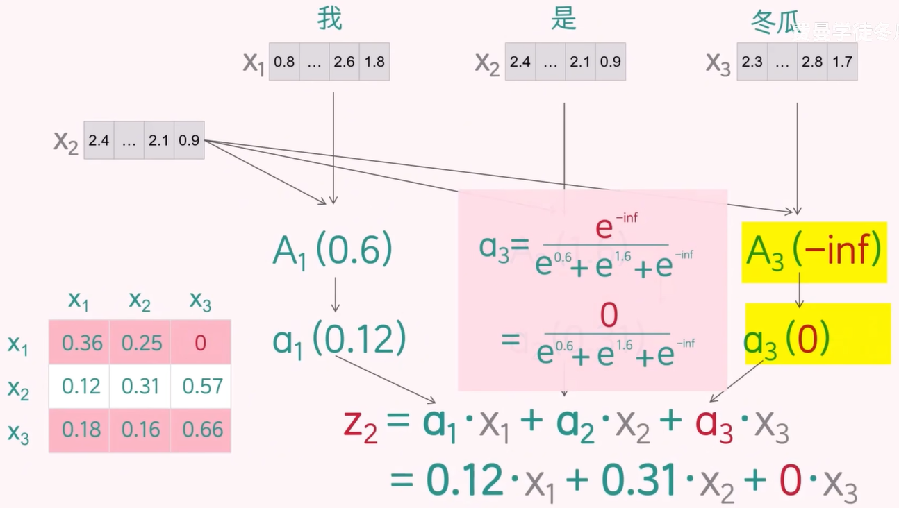 具体做法是:将当前 token 之后的所有点积结果替换为负无穷(-inf),这样在 softmax 计算中,由于 e 的 -inf 是 0 ,这些位置的注意力权重将变为 0,从而确保模型只能关注当前位置及其之前的 token。这种掩码机制有效防止信息泄露,使模型在训练阶段遵循自回归的因果结构。