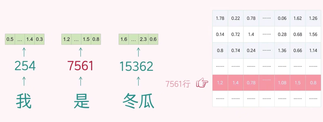 然后,根据这个 ID 到向量矩阵中检索,就可以得到该 token 的向量。(下图中其实应该是 第 7562 行)
