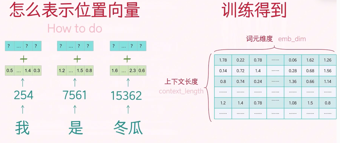 对于训练得到的,行数是上下文长度 context_length,来表示每个位置的信息,列是 d_model,同样和 token 向量初始一样,都是随机初始化的向量,以确保位置向量可以和 token 向量进行同维度相加。