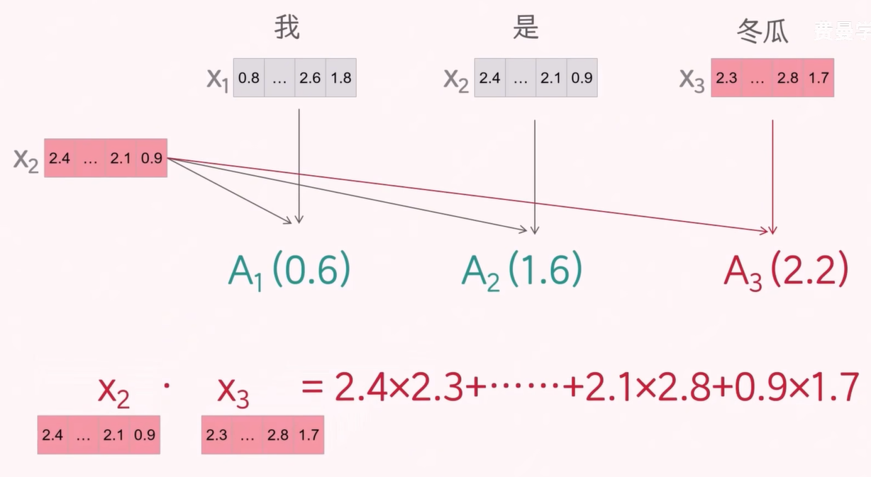以第二个 token 为例,将它的 token 向量和所有 token 向量进行点积计算。点积结果越大,说明两个向量的相似度越高,也代表这个 token 的注意力权重越高。