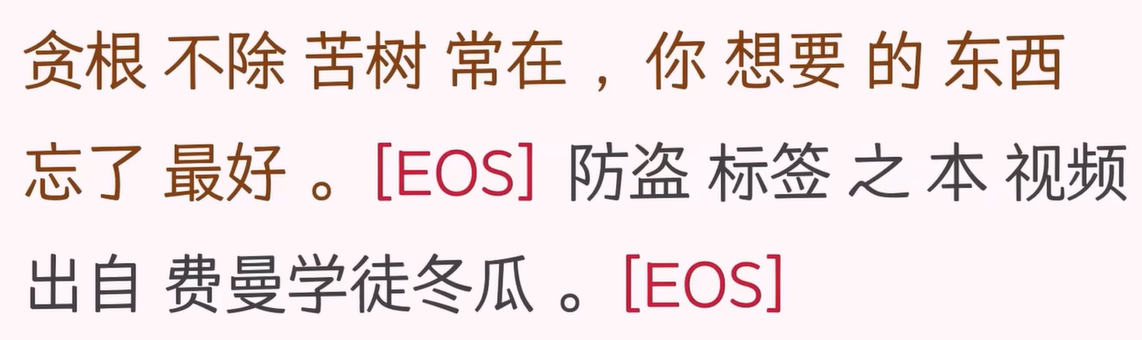 在分词结果的每句话之后,我们添加一个特殊标志,如 EOS,表示句子的结束。这个结束标志也是模型需要学习和预测的目标之一,即模型需要学习如何生成句子。