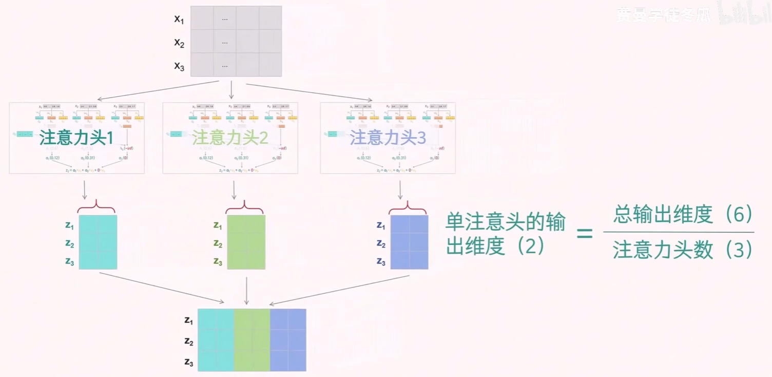 以 3 个注意力头为例,每一路都有自己的 QKV 参数(有些变种会共享 QKV),生成自己的 QKV 向量,计算自己的注意力,最后得到自己的输出。将所有的输出向量拼在一起,就得到了多头注意力的输出。