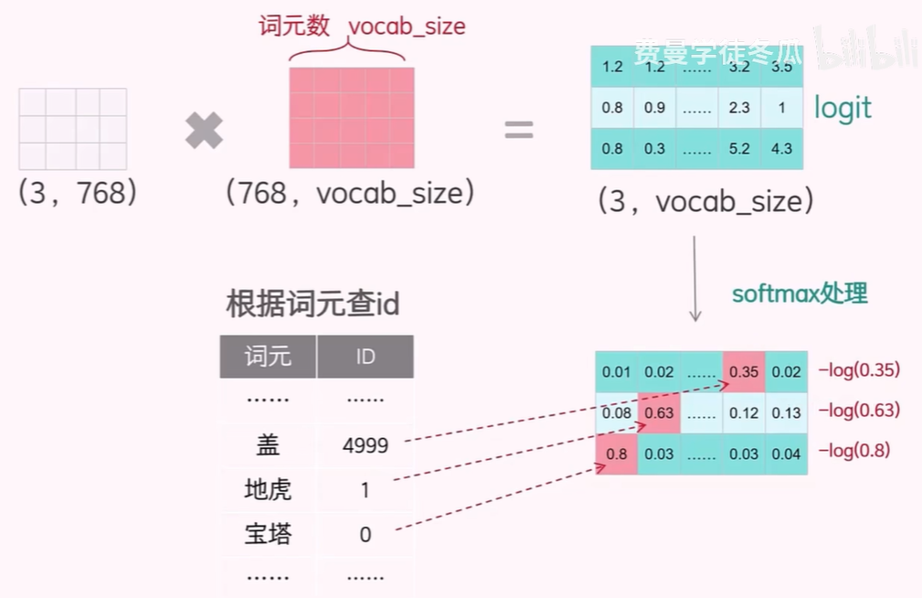 然后要找到哪个概率值是目标词(目标词是在训练过程中,我们希望模型能够正确预测的词,也就是实际上正确的 next token)的预测概率,找到概率之后,就可以计算这个 token 的交叉熵损失。
