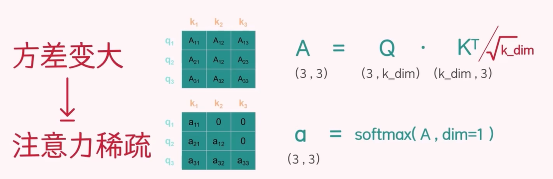 之所以在注意力计算中要除以 √dk,是因为在进行 Q · Kᵀ 点积后,结果的方差会显著增大。这意味着某些注意力得分可能非常大,而另一些则非常小,导致 softmax 归一化后的注意力分布极度不均衡,甚至可能出现大部分权重接近于 0 的情况。