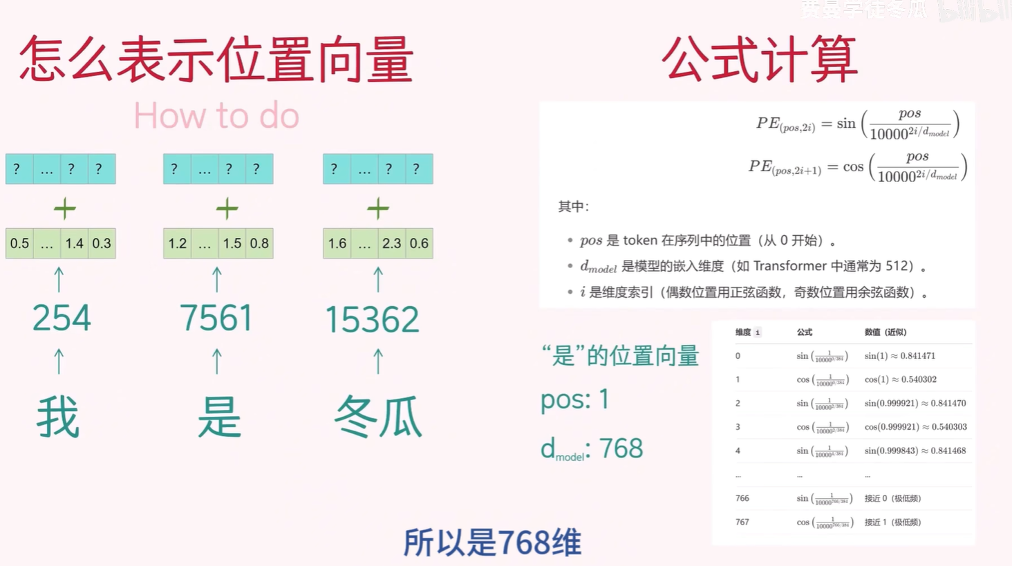 对于公式计算得到的,是 《Attentin Is All You Need》论文中关于位置向量的计算方法,偶数索引使用第一个公式,奇数索引使用第二个公式,下图以“是”为例,可以直接计算得到。