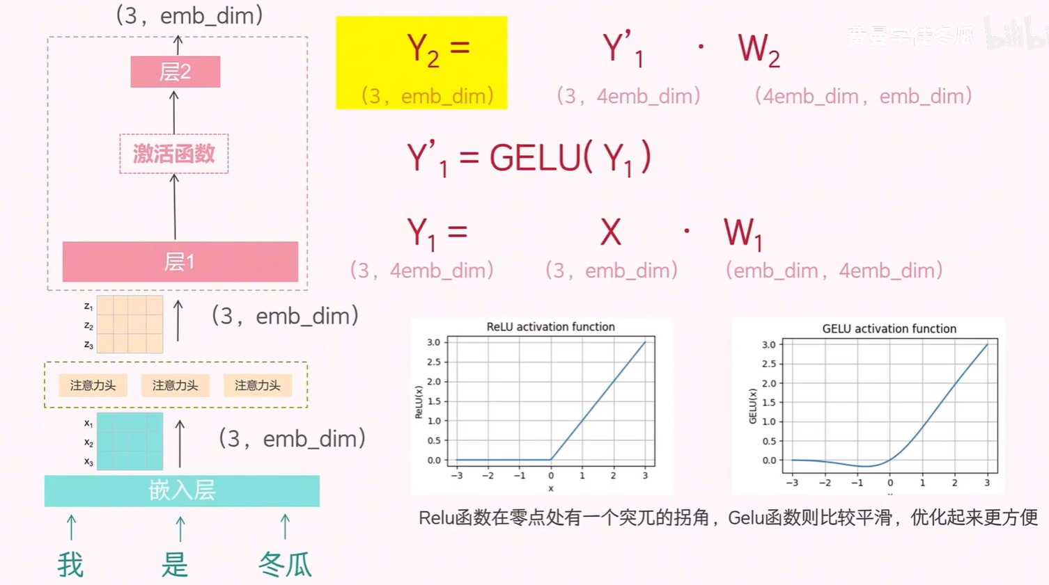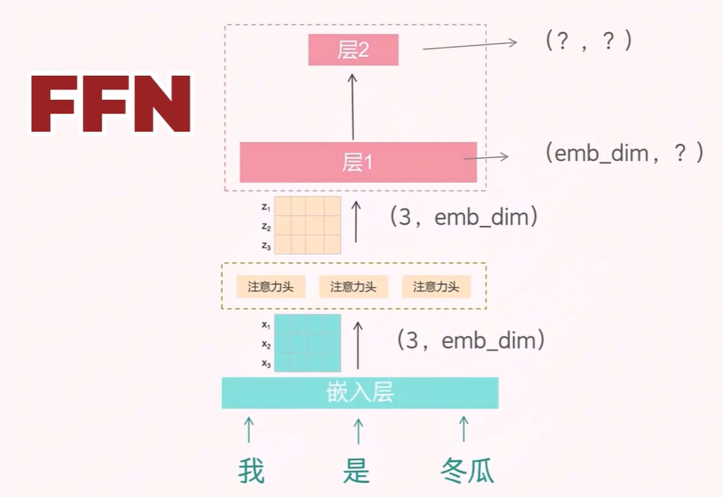 在注意力机制之后,Transformer 还包含一个前馈神经网络(Feed Forward Network, FFN)层。FFN 由两个全连接层组成:第一层将输入向量升维,第二层再将其降维回原始维度。