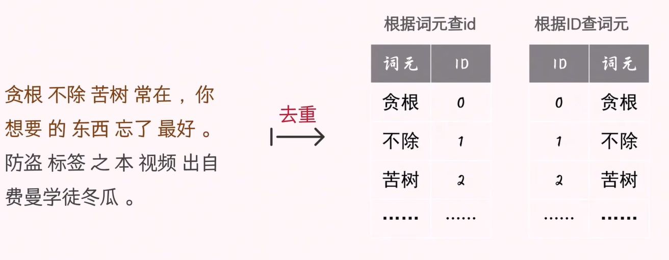 在获得语料库后,我们首先对其进行分词处理,得到每个 token。然后,我们对这些 token 进行去重,形成一个庞大的词典。接下来,我们对这些 token 进行编号,创建 token 到 ID 的匹配表和 ID 到 token 的匹配表。