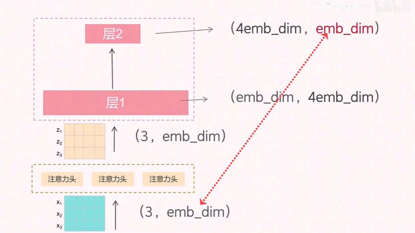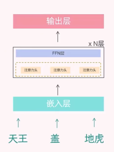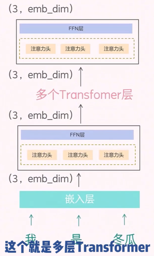 由于 Transformer 层的输入输出维度保持一致,因此可以堆叠多个 Transformer 层。每一层都在前一层的基础上进一步提取语义信息,从而逐步构建出对整段文本的深层理解。