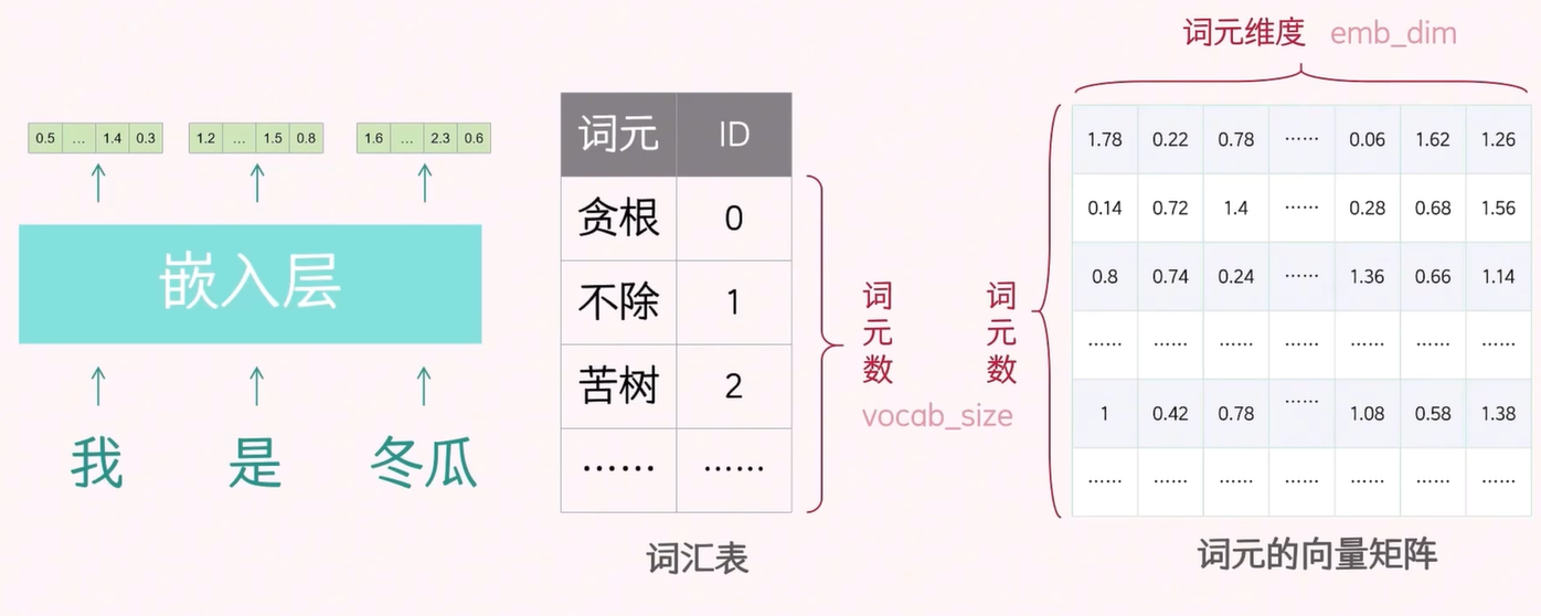 由于文本不能直接用于数学计算,我们需要将文本转换成向量形式,以便模型能够处理。这一过程的目的是使向量能够携带足够的信息量,这就是 token 嵌入层的作用。