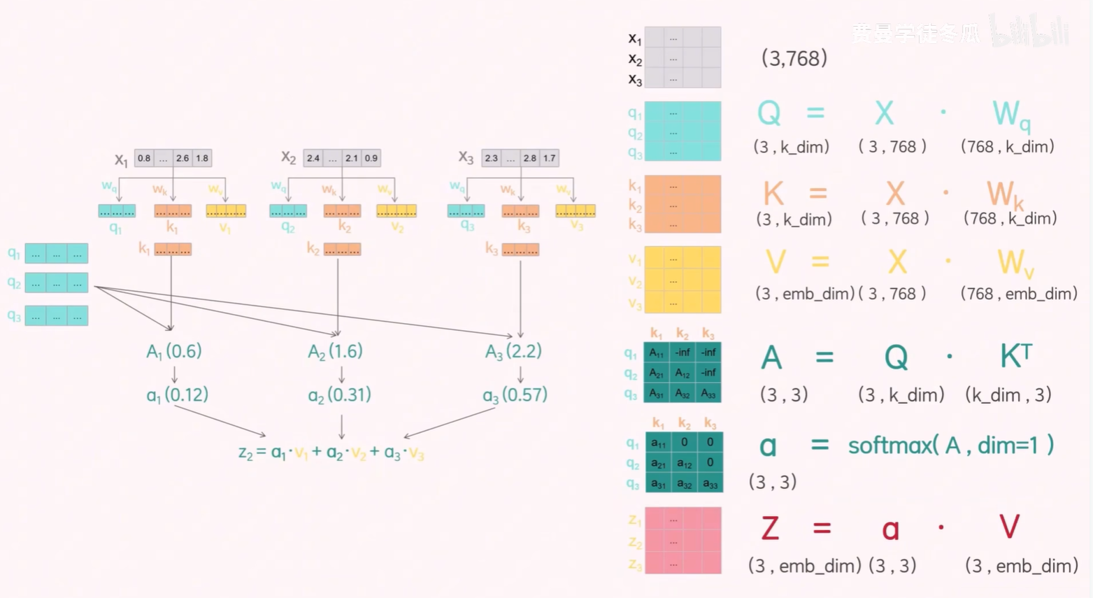 按照上面的公式进行计算,其实本质上还是矩阵计算,这里以 GPT-2 为例,d_model = 768,Wq 的维度要和 Wk 的维度一致,因为要实现 Q · KT,一般 Wk 的 emb_dim 一般也是 token 向量的维度(此处是 768).