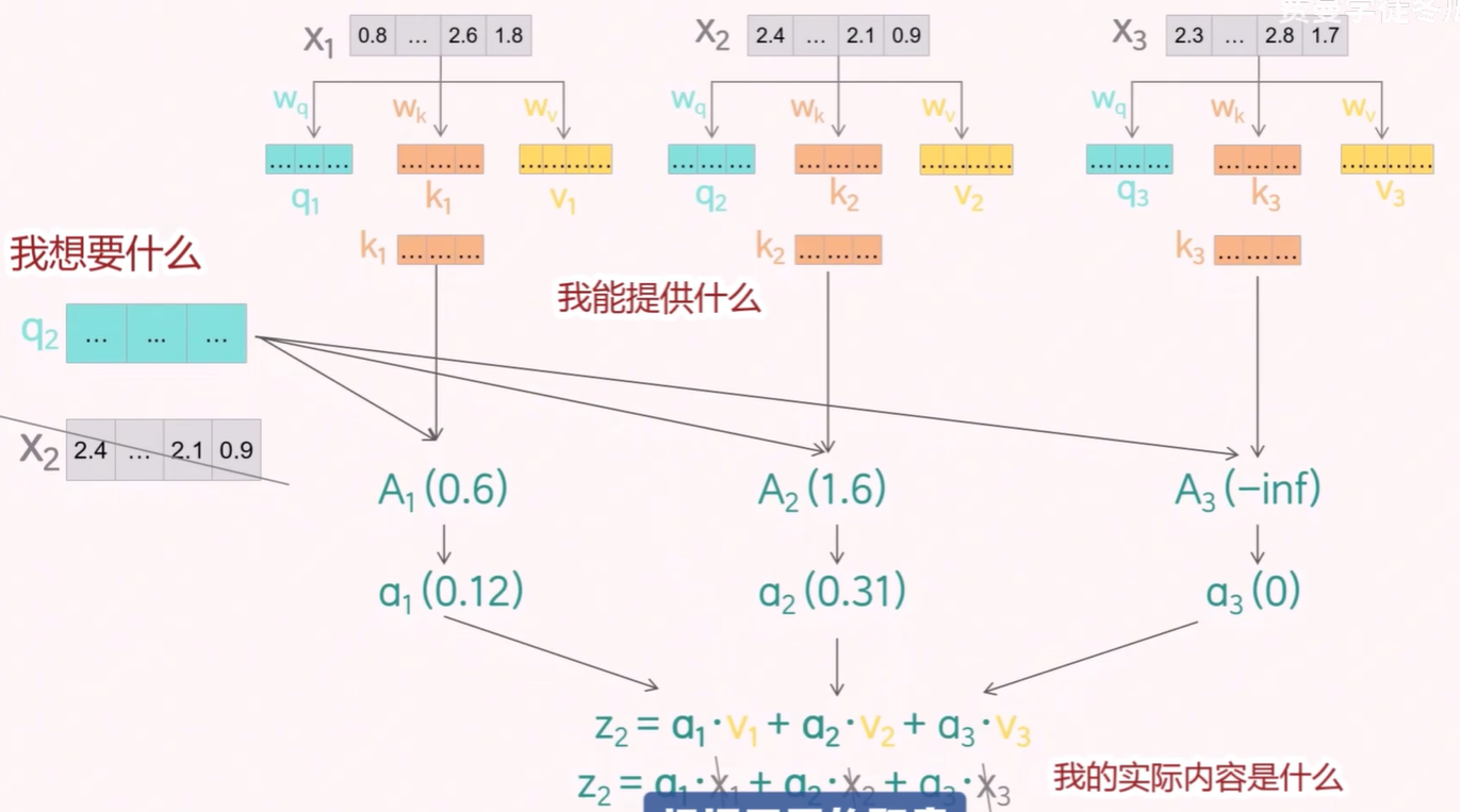 将 token X2 的 token 向量换成 q2 向量,q 向量表示查询的内容,k 向量表示键的内容,v 向量表示值的内容。这三个向量根据不同的职责表达不同的语义,模型自然会有更强的表达能力。于是使用 q2 向量和其余的 token 对应的 k 的转置(T)向量相乘,得到注意力分数矩阵,然后除以根号 dk 进行缩放,接着应用掩码(Mask)机制,最后通过 softmax 归一化得到注意力权重矩阵,再与 v 相乘得到最终的上下文向量。