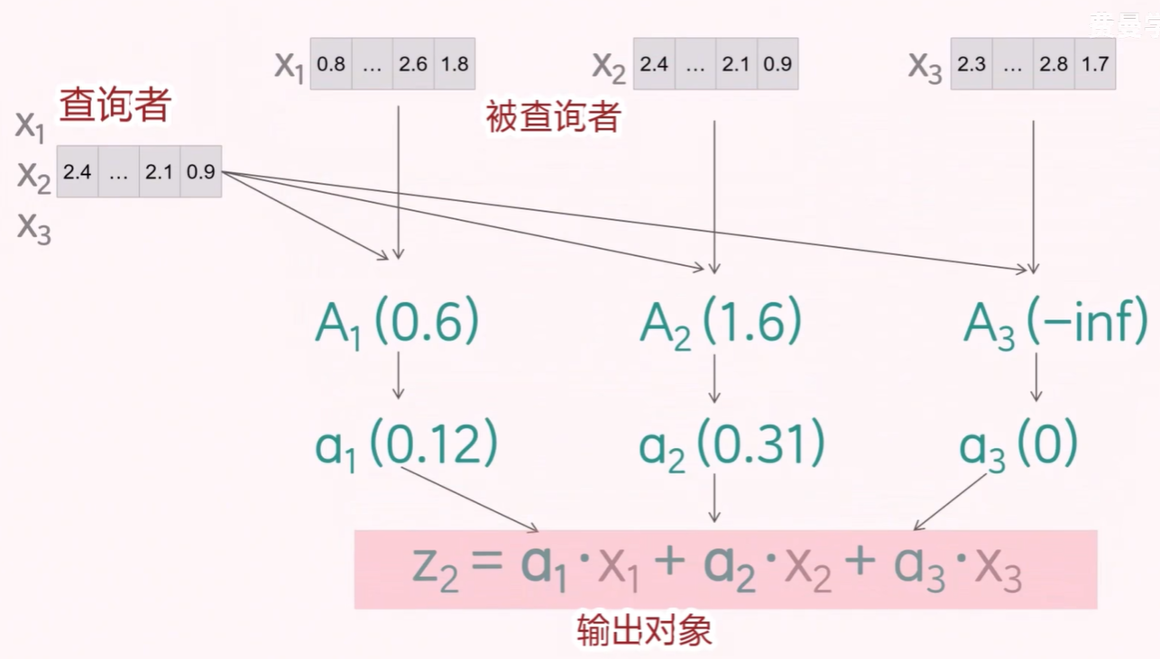 对于 token X2, 将注意力权重得分进行 softmax 归一化,得到最终的注意力权重分数。