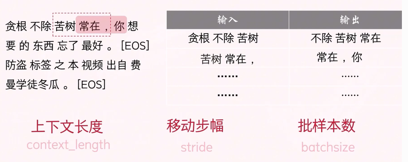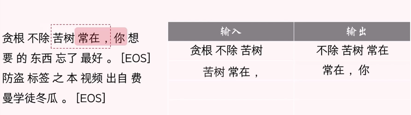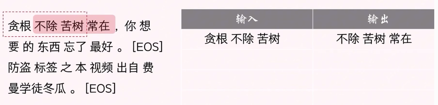 接下来,我们开始采样训练数据。假设模型每次最多可以处理 3 个 token,那么这 3 个 token 贪根 不除 苦树 就可以作为输入数据。然后,我们将其向右移位 1 个 token,得到目标数据 不除 苦树 常在。