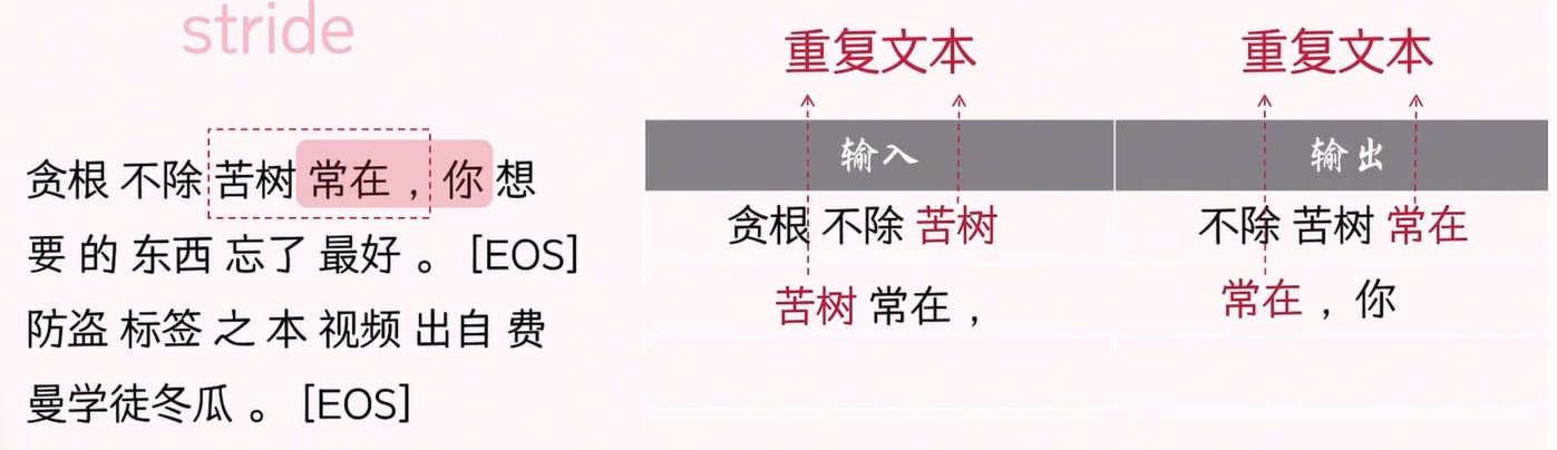 采样过程中,我们使用一个参数 stride 来控制移动步幅。stride 设置得小,会导致更多的文本重复;设置得大,重复的文本就少。当 stride 大于上下文长度时,文本将不会重复。如果 stride 设置过小,模型可能会学习到大量重复数据,从而容易过拟合。