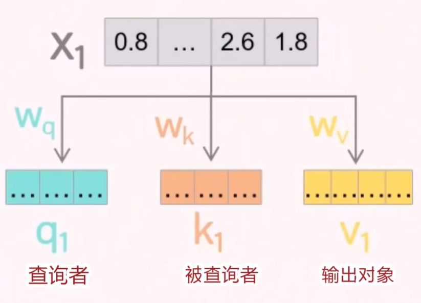 于是将这三种身份直接拆开,引入 Wq、Wk、Wv 三个可学习的参数矩阵,原始的 token 向量乘上这三个参数矩阵,得到三个新的向量 q(查询者)、k(被查询者)、v(输出对象)。