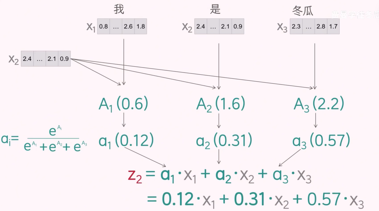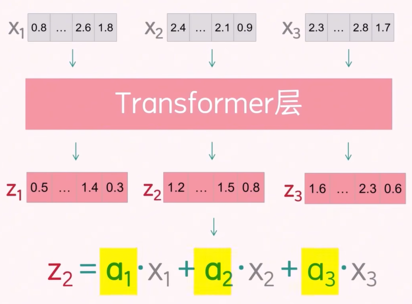当我们将 3 个 token 向量输入到 Transformer 层时,得到的 3 个向量已经捕捉到了其他 token 的注意力信息。这些新向量是通过将旧向量与注意力权重相乘并求和得到的,其中 α1、α2、α3 是通过 softmax 归一化的注意力权重得分。