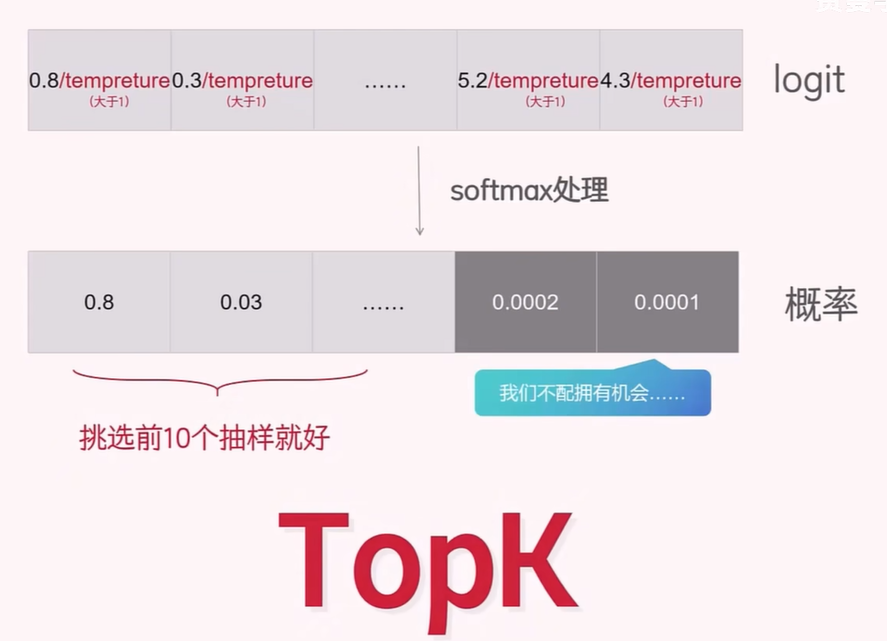 将 logits 除以一个大于 1 的数(temperature),使 softmax 后的分布更平滑、均匀。较高的 temperature 会增加多样性,较低的 temperature 会增强确定性。