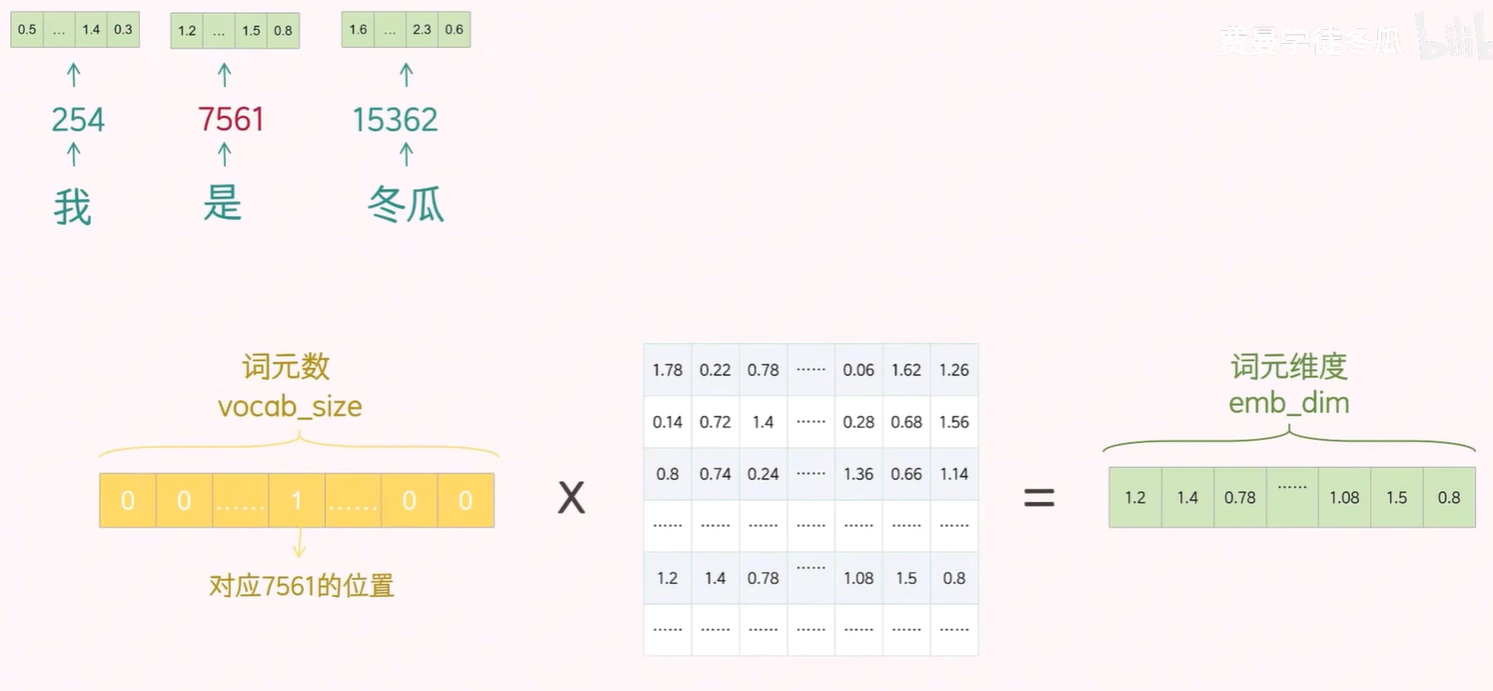 为了解决这一问题,通常会将该检索过程转化为可导的线性操作,即使用矩阵乘法来实现。具体做法是:将 token ID 表示为一个 one-hot 向量,其长度等于词表大小,在该向量中,目标 token 对应的位置为 1,其余位置为 0。将该 one-hot 向量与 token 向量矩阵相乘,即可得到对应的 token 向量。