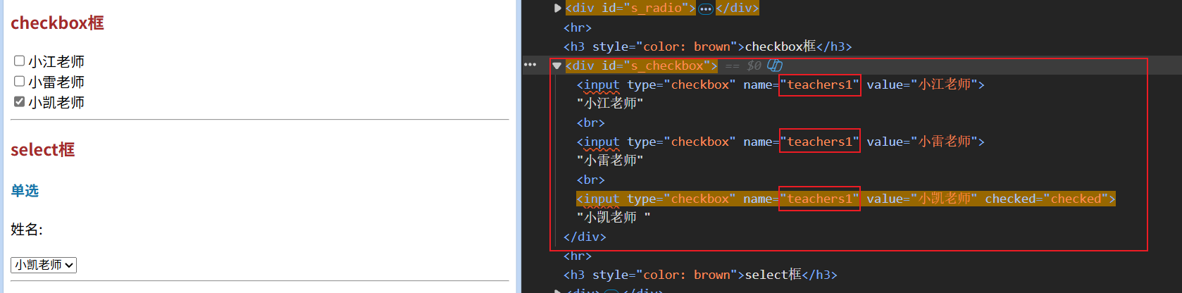 driver.implicitly_wait(10)driver.get("https://www.byhy.net/cdn2/files/selenium/test2.html")# chekbox选项框driver.find_element(By.CSS_SELECTOR, "#s_checkbox > input[type=checkbox]:nth-child(3)").click()eles = driver.find_elements(By.CSS_SELECTOR, "[name=teachers1]:checked")for e in eles:print(e.get_attribute("value"))