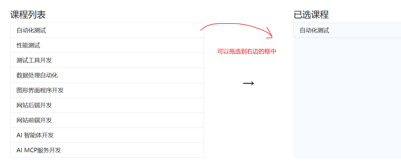 time.sleep(3)for i in range(1,6):#鼠标拖放ac.drag_and_drop(# 拖动的元素driver.find_element(By.ID, "course-" + str(i)),# 放到的位置driver.find_element(By.ID, "selected-courses")).perform()time.sleep(1)