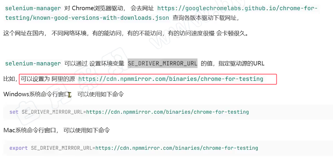os.environ['SE_DRIVER_MIRROR_URL'] = \'https://cdn.npmmirror.com/binaries/chrome-for-testing'from selenium import webdriverwd = webdriver.Chrome() # 自动下载浏览器驱动wd.get("https://www.baidu.com/index.php?tn=75144485_1_dg&ch=9")input("敲回车退出")