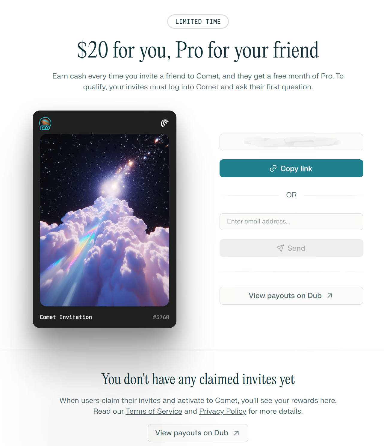 Comet 的早期用户激励计划($20 USD/每位有效邀请),显然是为了快速吸引一批具备技术能力和前沿意识的核心用户参与测试与反馈。