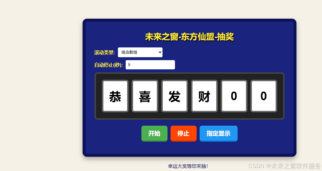 <body><div class="machine"><h1 class="title">未来之窗-东方仙盟-抽奖</h1><div class="config-group"><label for="typeSelect">滚动类型:</label><select id="typeSelect"><option value="num">数字范围</option><option value="array">数字数组</option><option value="innerarray">字符数组</option><option value="grouparray" selected>组合数组</option></select></div><div class="config-group"><label for="autoStopInput">自动停止(秒):</label><input type="number" id="autoStopInput" min="0" value="5"></div><div class="display"><div id="lotteryContainer" class="numbers"><!-- 数字框将由JS动态生成 --></div></div><div class="controls"><button id="startBtn" class="control-btn">开始</button><button id="stopBtn" class="control-btn">停止</button><button id="setBtn" class="control-btn">指定显示</button></div></div><div class="footer">幸运大奖等您来抽!</div><script>// 抽奖动画函数封装let container = document.getElementById('lotteryContainer');let lottery新 = $cq.灵枢数列随机({container: container,type: "grouparray", // 使用组合数组模式groupArray: ['8888', '东方仙盟', '一等奖', '9999', '1234', '仙盟必胜', '二等奖', '三等奖', '特等奖'], // 组合数组speed: 100, // 滚动速度displayLength: 6, // 显示4个方块initialValues: ['东','方','仙','盟'] // 初始显示值});// 页面加载完成后初始化document.addEventListener('DOMContentLoaded', function() {// 获取容器和按钮const autoStopInput = document.getElementById('autoStopInput');$cq("#startBtn").事件('click', () => {const autoStopSeconds = parseFloat(autoStopInput.value) || 0;lottery新.start(autoStopSeconds);});$cq("#stopBtn").事件('click', () => {lottery新.stop();});$cq("#setBtn").事件('click', () => {lottery新.setDisplayValues("恭喜发财");});$cq("#typeSelect").事件('change', () => {lottery新.changeType(typeSelect.value);});});</script>