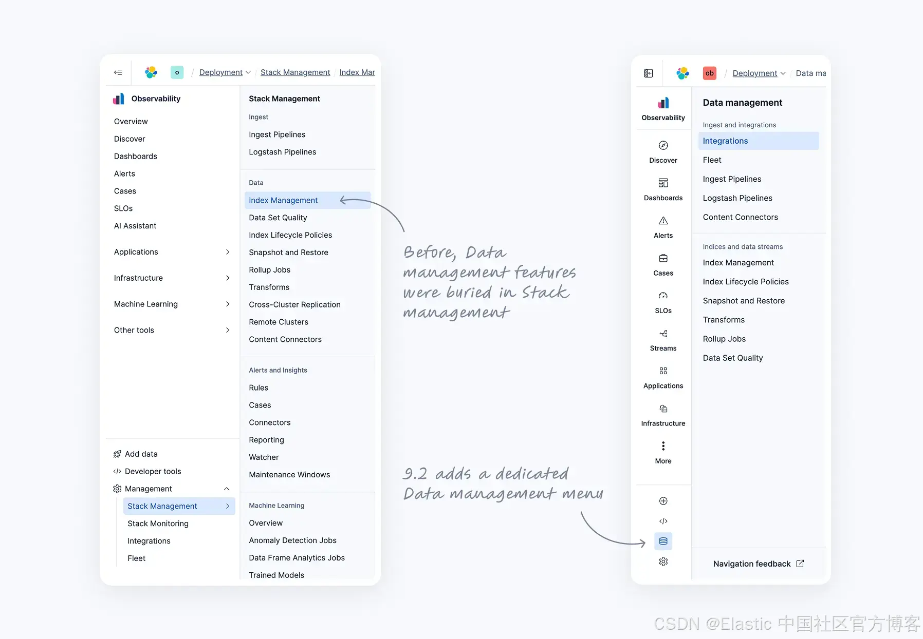 在 9.2 中,更新后的导航系统解决了这些问题,使在展开和折叠模式下的导航更快、更直观。刷新后的导航已在 Elastic Cloud Serverless,以及在 Elastic Cloud 托管和本地启用解决方案视图的空间中可用。