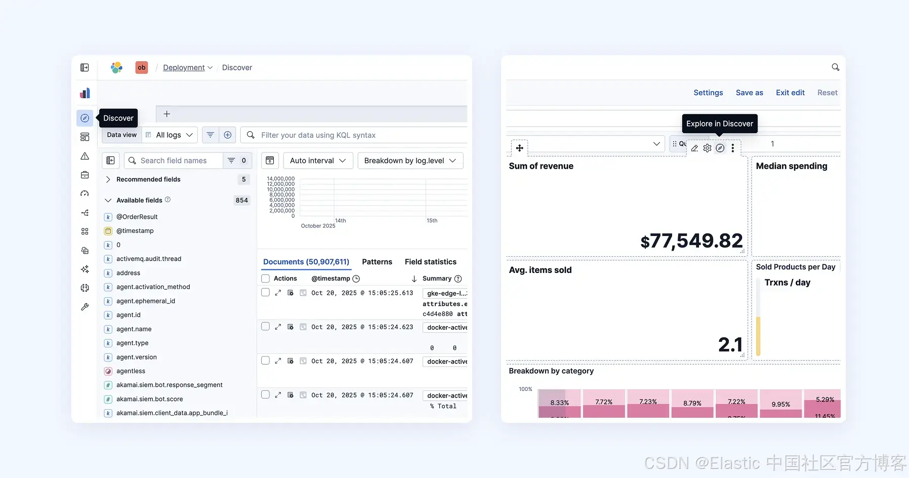 为了提供完全可用的折叠模式 —— 一项备受用户期待的功能 —— 我们开发了可以收缩为图标列的导航系统。早期 UX 测试显示,这一设计受到用户欢迎。通过将 Kibana 的抽象概念与独特图标进行视觉关联,导航变得更直观、更易记、更高效。例如,Discover 中的 Explore 在导航中使用相同的 Discover 图标,使其更易识别。我们还支持可选文本标签,在展开模式下可见,在折叠模式下作为工具提示显示。最后,这种方法允许在需要时同时显示两个导航面板 —— 以往由于屏幕空间有限,这是不切实际的。