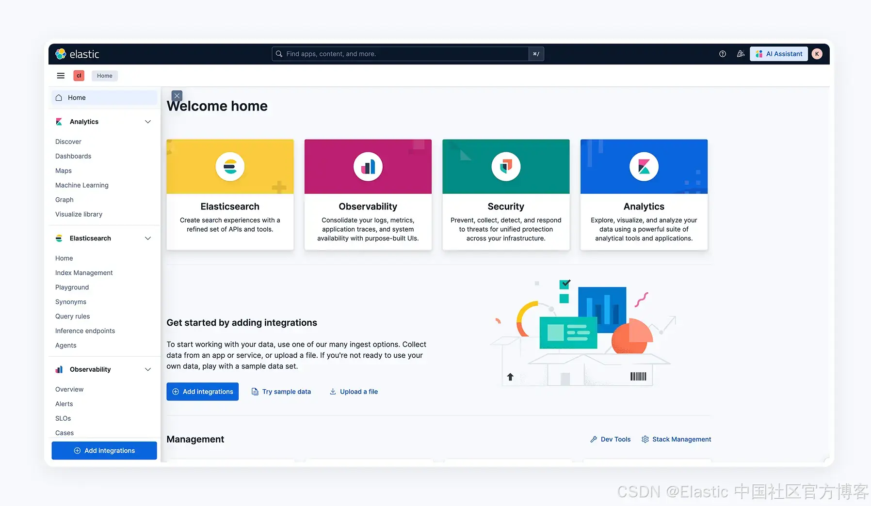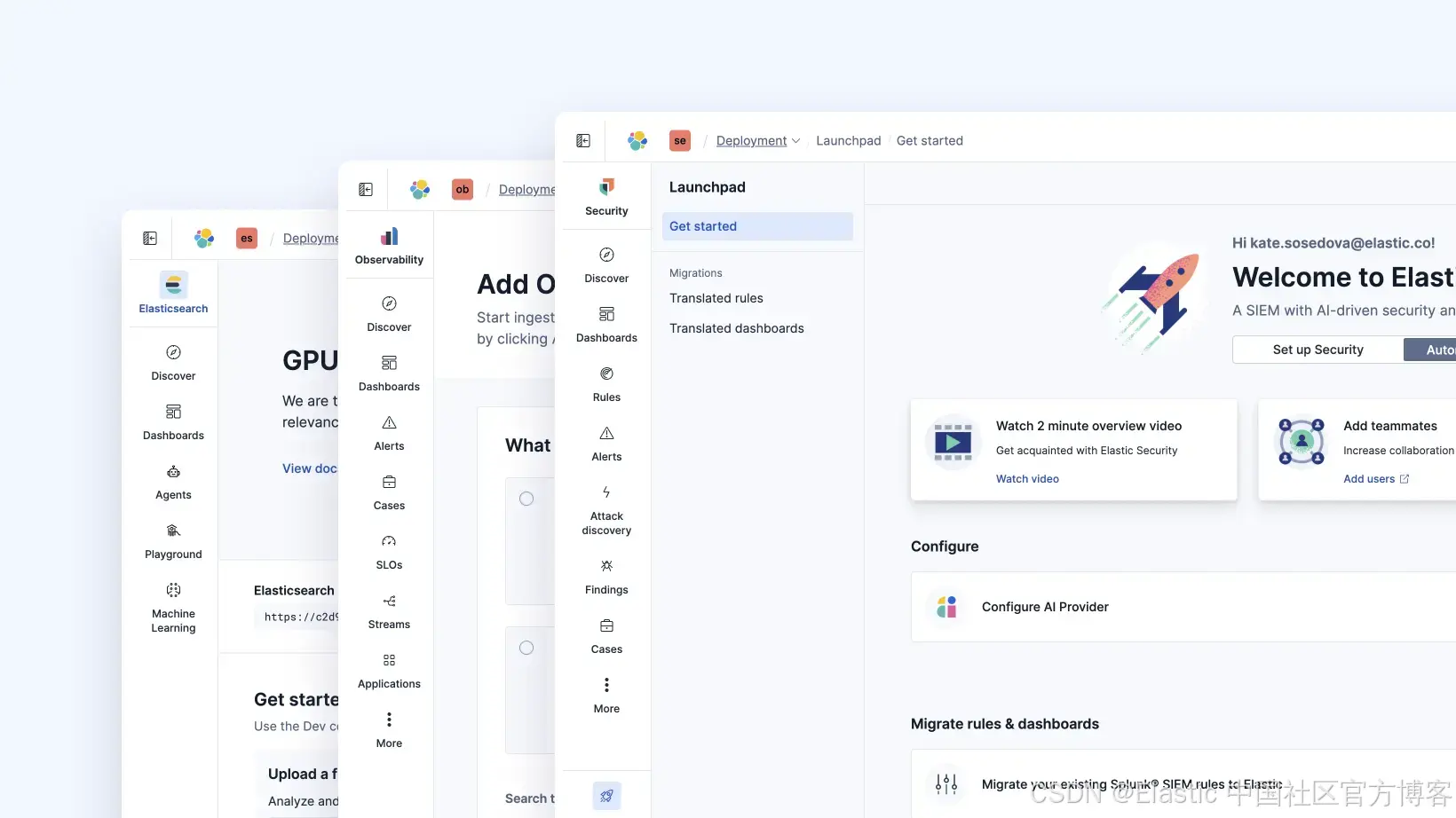 无论是在 Elastic Cloud 托管环境还是本地部署,你都可以配置空间,只显示单一解决方案视图 —— Security、Observability 或 Elasticsearch 功能,而不是传统的经典视图一次显示所有内容。