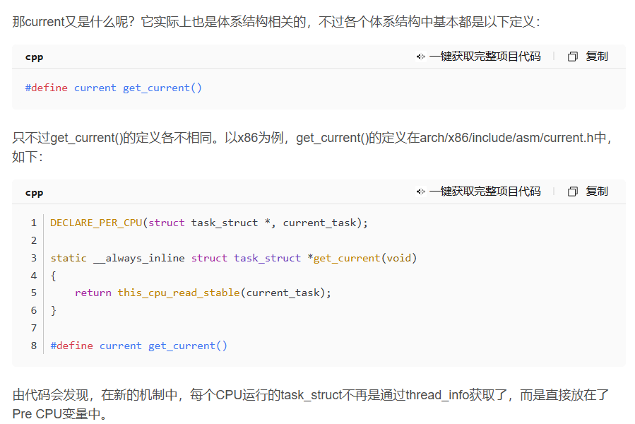 当要获取当前运行中的task_struct的时候,就需要调用this_cpu_read_stable()进行读取。而这正是current及get_current()所做的事情。