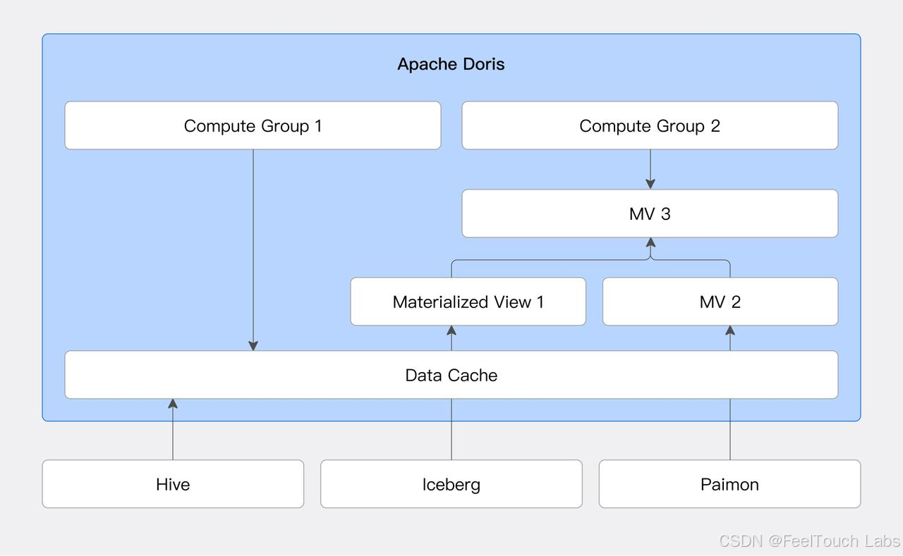 在该场景中,Doris 作为 计算引擎,对湖仓中数据进行查询分析加速。