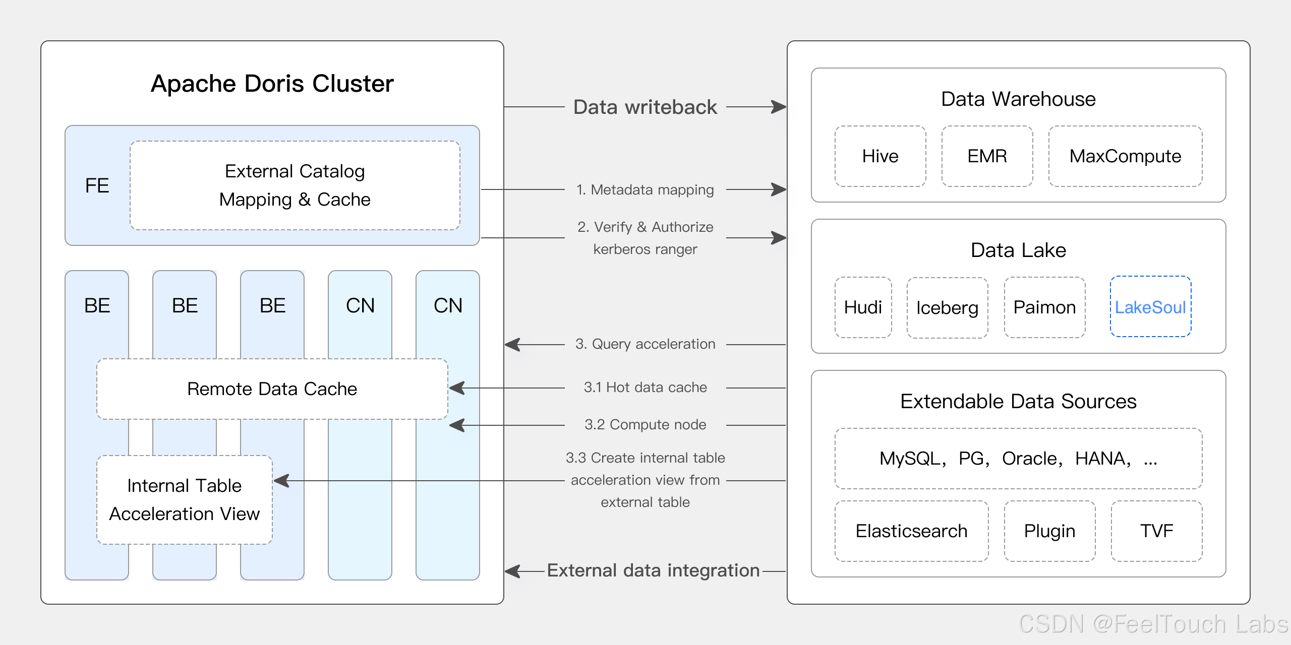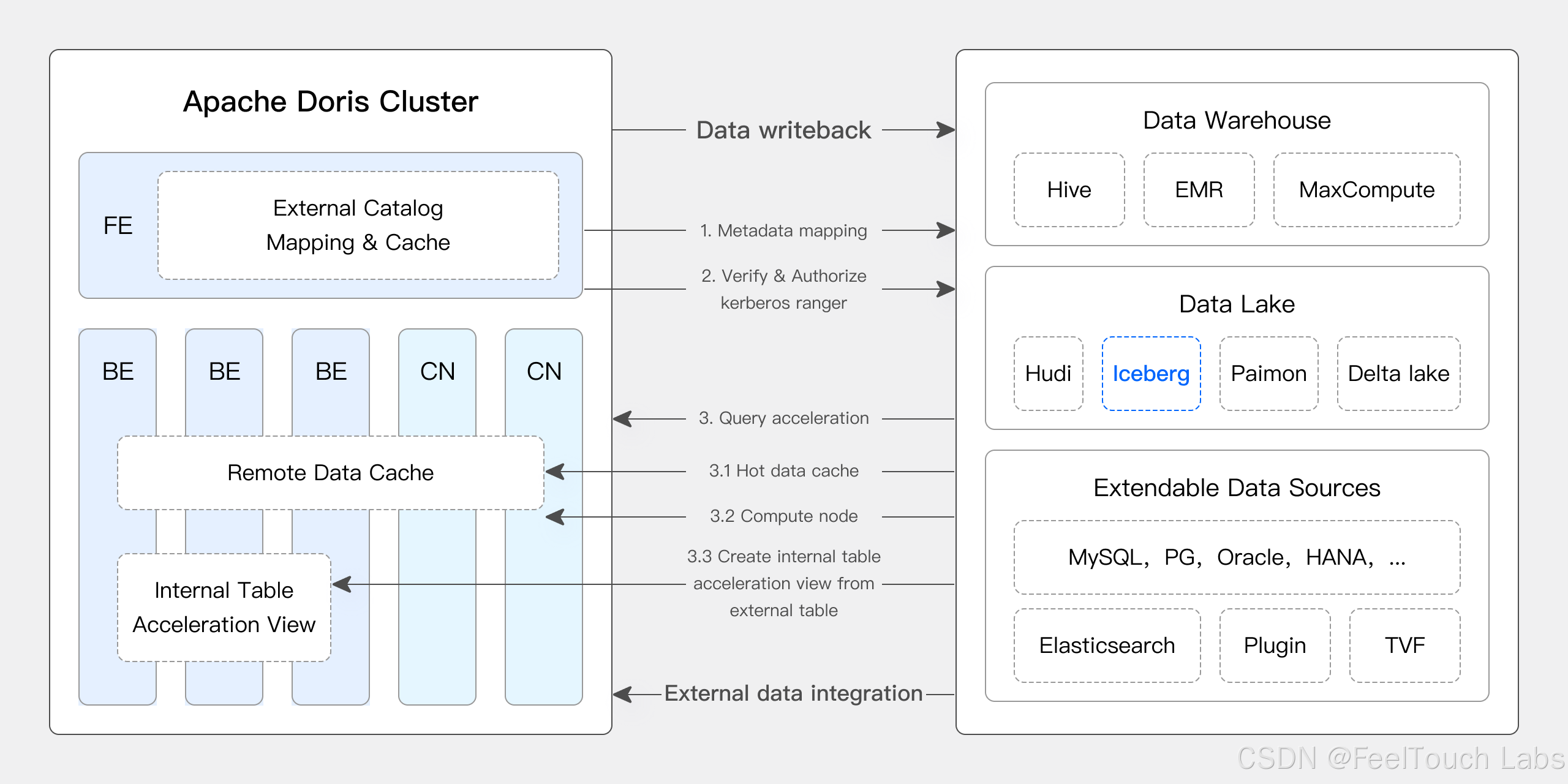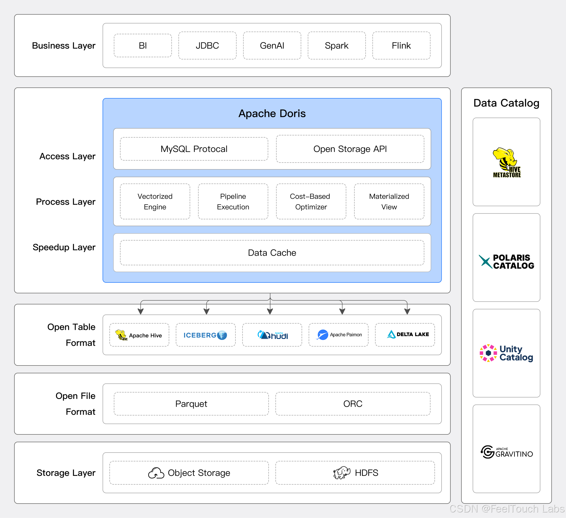 无论是 Hive、Iceberg、Hudi、Paimon,还是支持 JDBC 协议的数据库系统,Doris 均能轻松连接并高效访问数据。