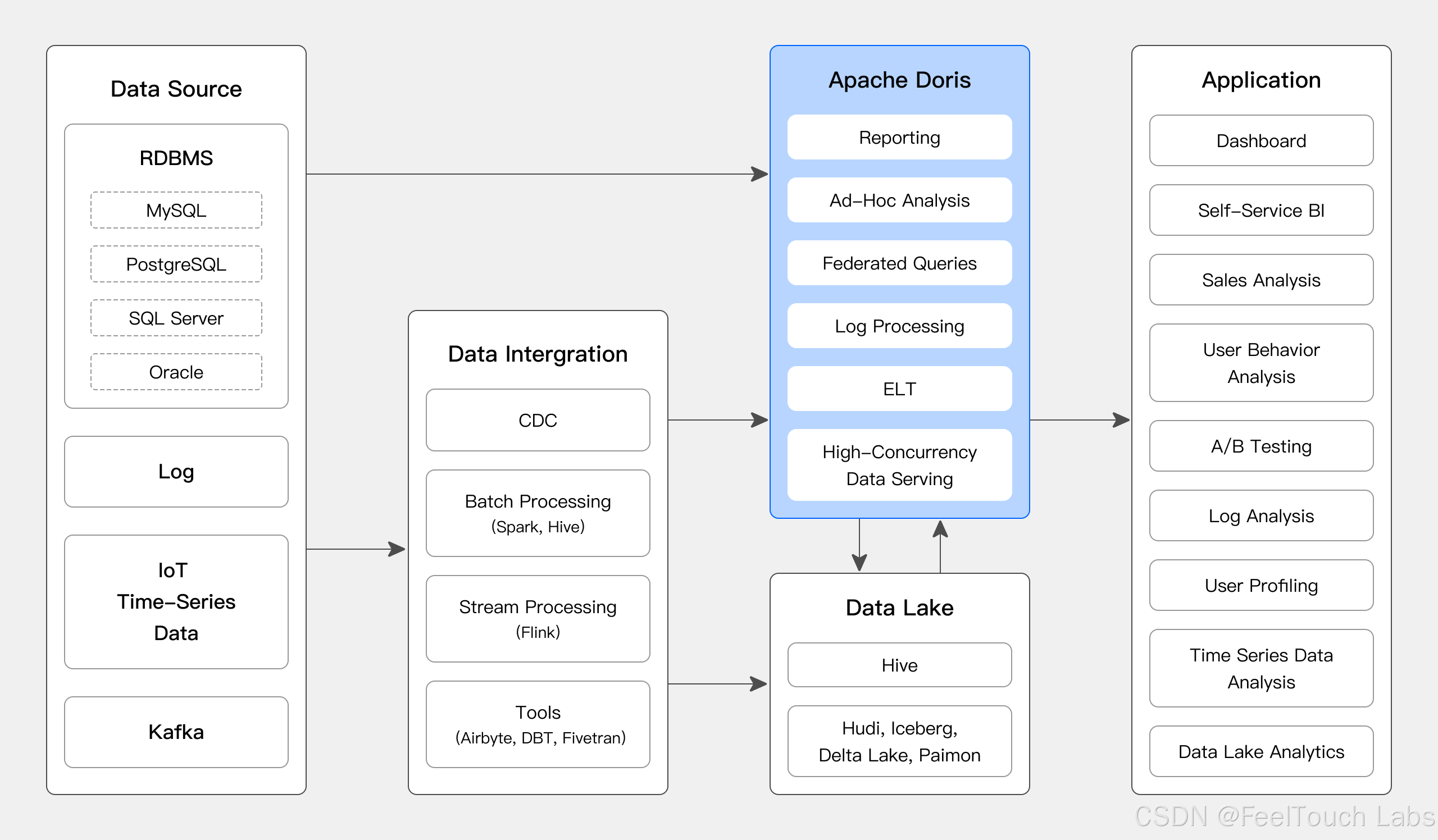 数据源经过各种数据集成和加工处理后,通常会进入实时数据仓库 Doris 和离线湖仓(如 Hive、Iceberg 和 Hudi),广泛应用于 OLAP 分析场景,如下图所示: