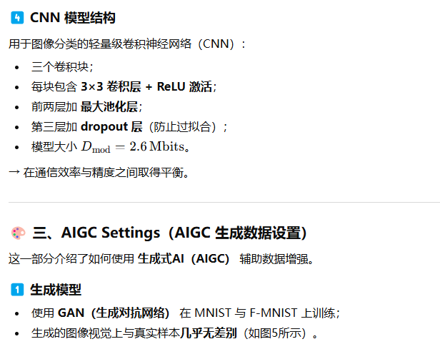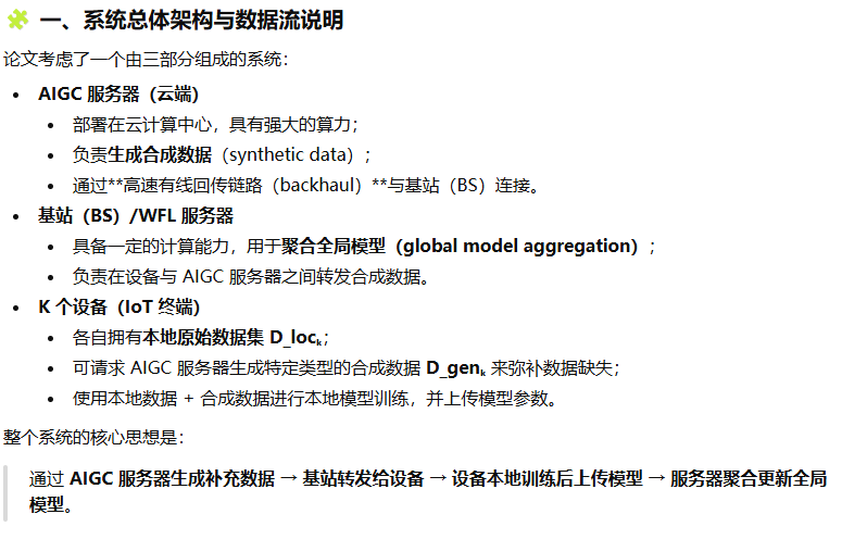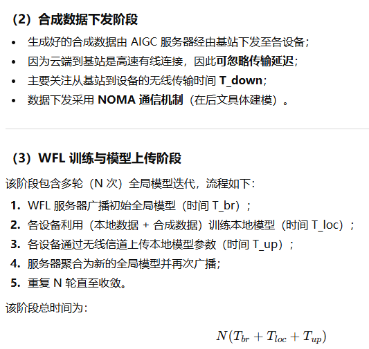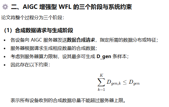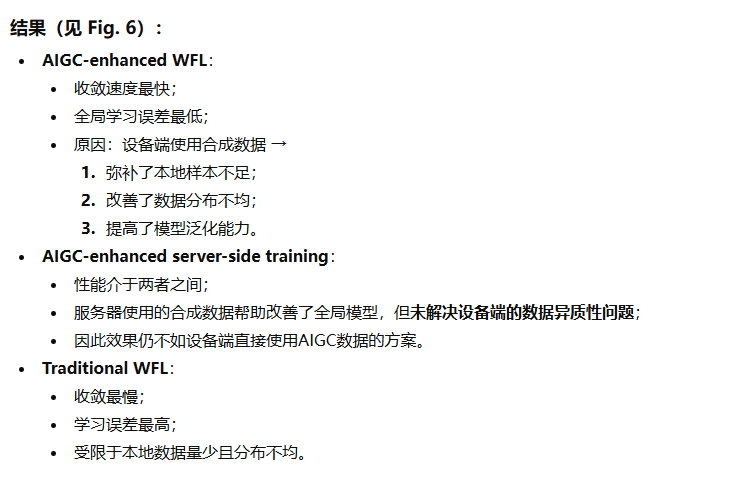在 无线联邦学习(WFL) 中,由于设备异构、数据有限且分布不均,可以利用 AIGC(人工智能生成内容) 来生成缺失的数据,从而提升本地训练效果和全局模型的收敛性能。