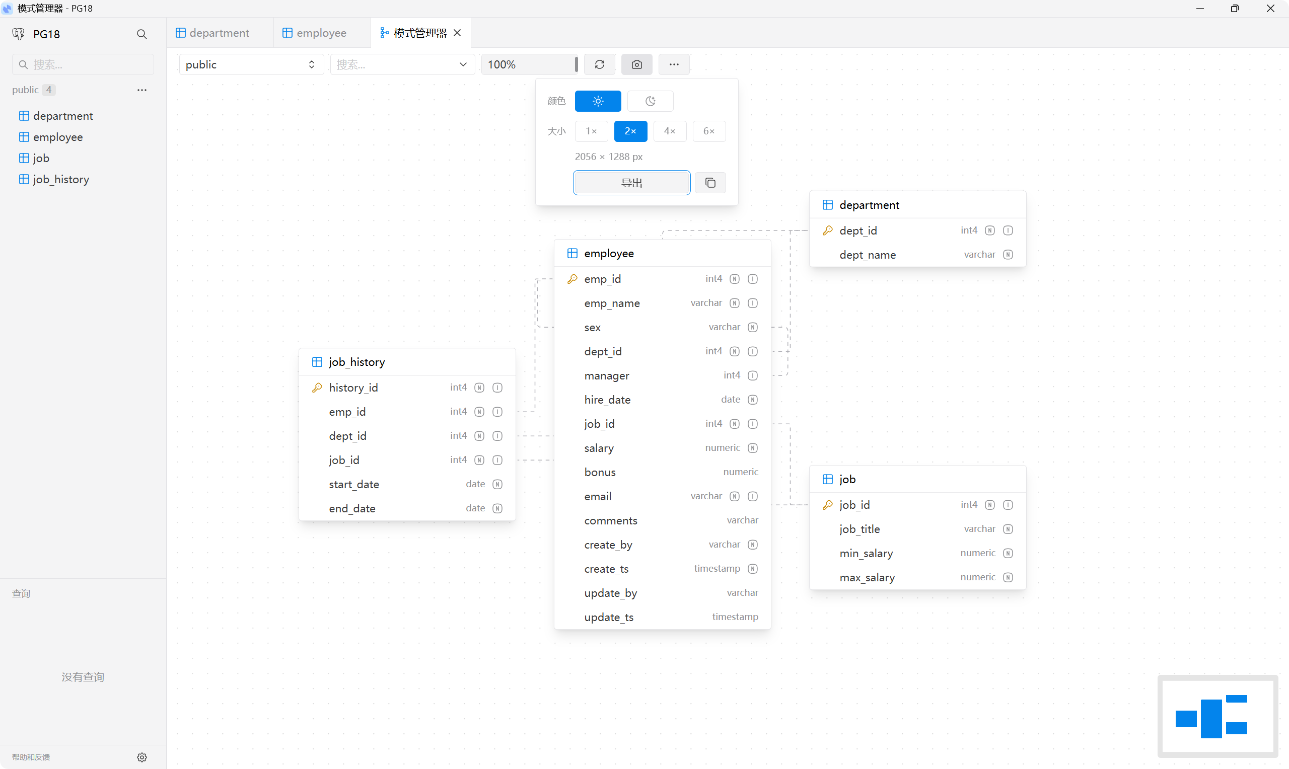 - 实体关系图:模式管理器可以展示图形化的表结构和关系,支持 DDL 复制以及导出图片功能。