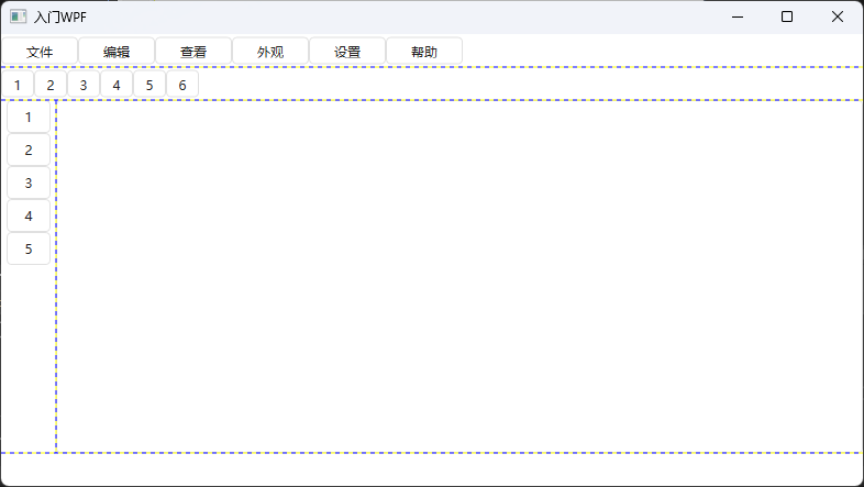<Window x:Class="Clock.MainWindow"xmlns="http://schemas.microsoft.com/winfx/2006/xaml/presentation"xmlns:x="http://schemas.microsoft.com/winfx/2006/xaml"xmlns:d="http://schemas.microsoft.com/expression/blend/2008"xmlns:mc="http://schemas.openxmlformats.org/markup-compatibility/2006"xmlns:local="clr-namespace:Clock"mc:Ignorable="d"Title="入门WPF" Height="450" Width="800" WindowStartupLocation="CenterScreen"><Grid ShowGridLines="true" ><Grid.RowDefinitions><RowDefinition Height="30"/><RowDefinition Height="30"/><RowDefinition/><RowDefinition Height="30"/></Grid.RowDefinitions><StackPanel Grid.Column="0" Grid.Row="0" Orientation="Horizontal" ><Button Height="25" Width="70" Content="文件"/><Button Height="25" Width="70" Content="编辑"/><Button Height="25" Width="70" Content="查看"/><Button Height="25" Width="70" Content="外观"/><Button Height="25" Width="70" Content="设置"/><Button Height="25" Width="70" Content="帮助"/></StackPanel><StackPanel Grid.Column="0" Grid.Row="1" Orientation="Horizontal" ><Button Height="25" Width="30" Content="1"/><Button Height="25" Width="30" Content="2"/><Button Height="25" Width="30" Content="3"/><Button Height="25" Width="30" Content="4"/><Button Height="25" Width="30" Content="5"/><Button Height="25" Width="30" Content="6"/></StackPanel><!--第三行加入grid布局,然后在grid里再增加两列--><Grid Grid.Row="2" Grid.Column="0" ShowGridLines="true" ><Grid.ColumnDefinitions><ColumnDefinition Width="50"/><ColumnDefinition /> </Grid.ColumnDefinitions><StackPanel Grid.Row="0" Grid.Column="0"><Button Height="30" Width="40" Content="1"/><Button Height="30" Width="40" Content="2"/><Button Height="30" Width="40" Content="3"/><Button Height="30" Width="40" Content="4"/><Button Height="30" Width="40" Content="5"/></StackPanel><TextBox Grid.Row="0" Grid.Column="1" TextWrapping="Wrap"/></Grid><!--<Button Grid.Column="0" Grid.Row="0" Width="40" Height="40" HorizontalAlignment="Left"/><Button Grid.Column="0" Width="40" Height="40" HorizontalAlignment="Left" Margin="53,0,0,0"/>--></Grid>