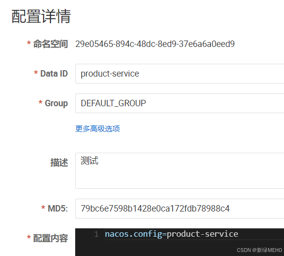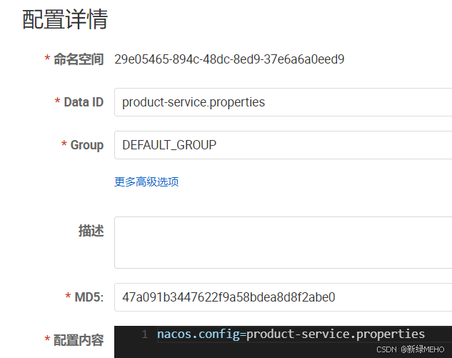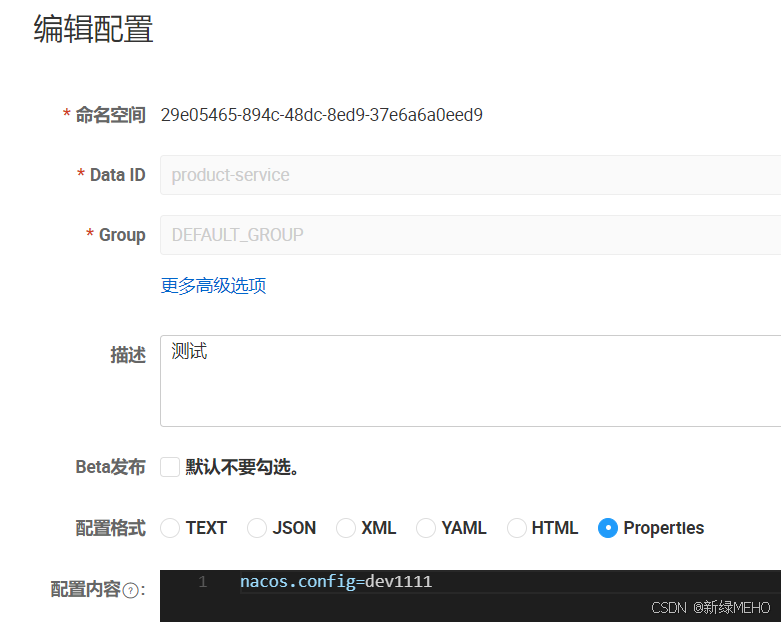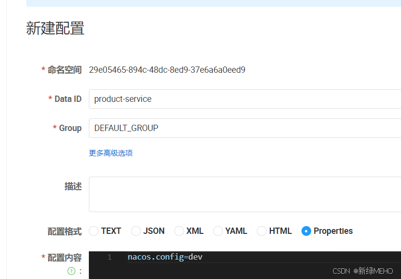 在Nacos配置中心添加三个配置,Data ID分别为:product-service,product-service.properties,product-service-dev.properties。