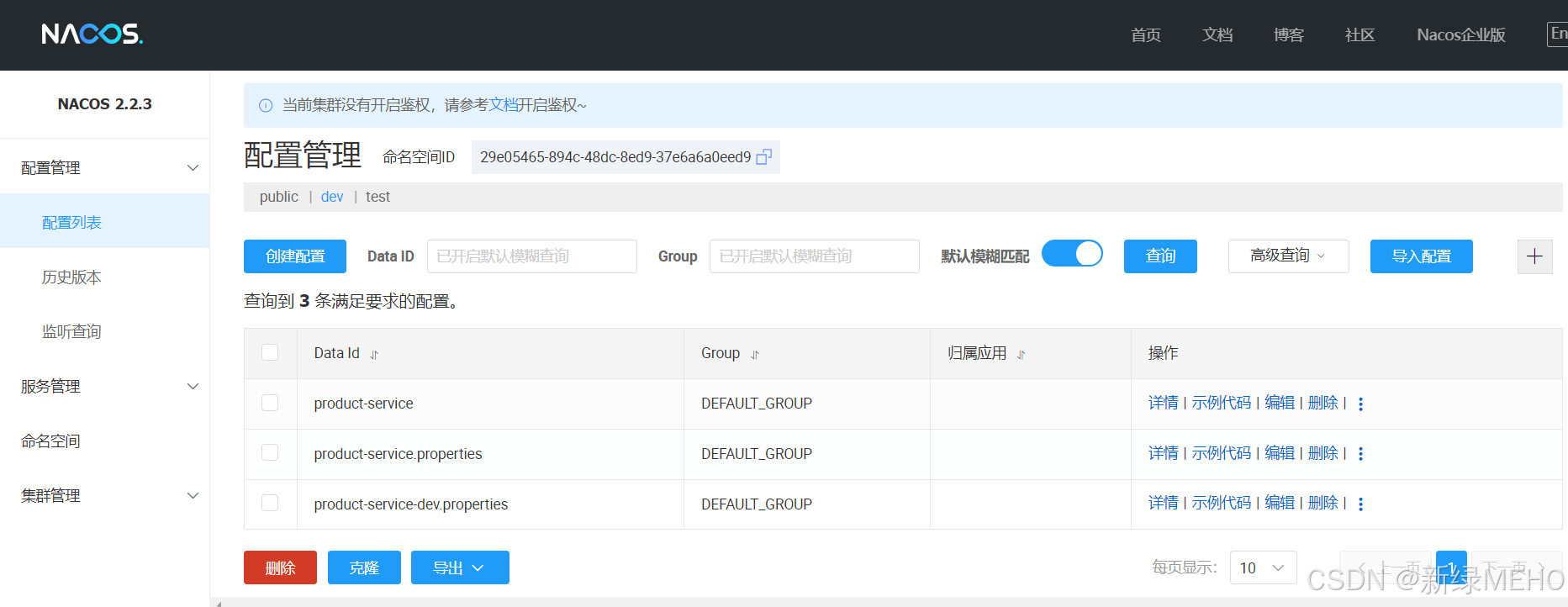 注意: 配置管理的命名空间和服务列表的命名空间是隔离的, 两个是分别设置的. 默认是public
