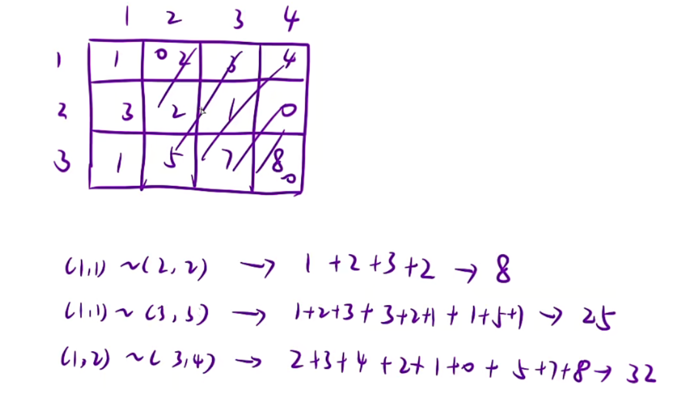 给一个二维数组,然后给左上角坐标和右下角坐标,求这个矩阵的和