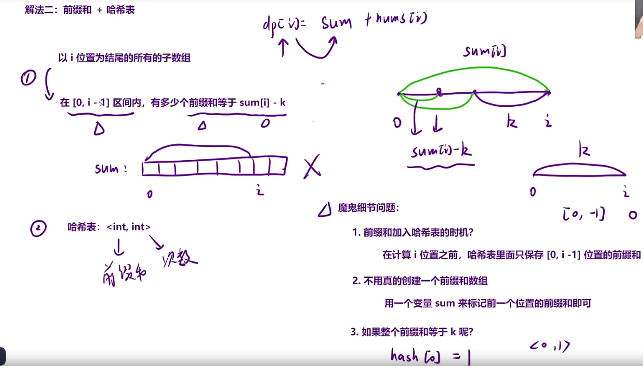 1.在计算i位置之前,只能保持[0,i-1]位置的前缀和,因为如果你是把所有的前缀和算出来,然后一股脑的扔到hash里面,就会导致重复计算,因为你算i位置的时候只是算i前面的子数组,并没有包括i后面的,所以如果你一股脑扔到哈希里面,就会导致后面的也算上了就会重复计算