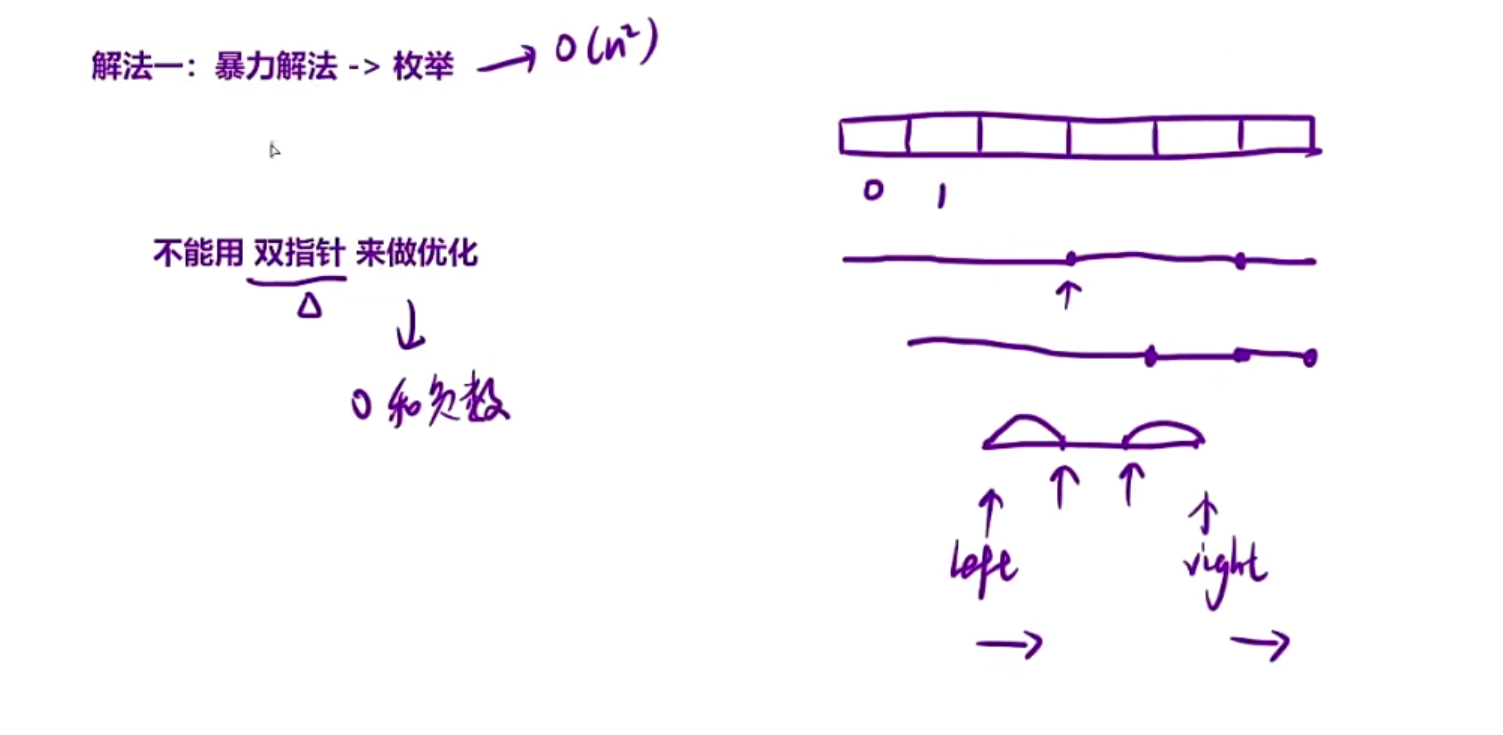 注意这里不能使用双指针(滑动窗口),因为滑动窗口是需要维持一个性质,left和right能够一直右移动,但是这里可能在left和right的中间还有符合的数组,所以right可能会左移