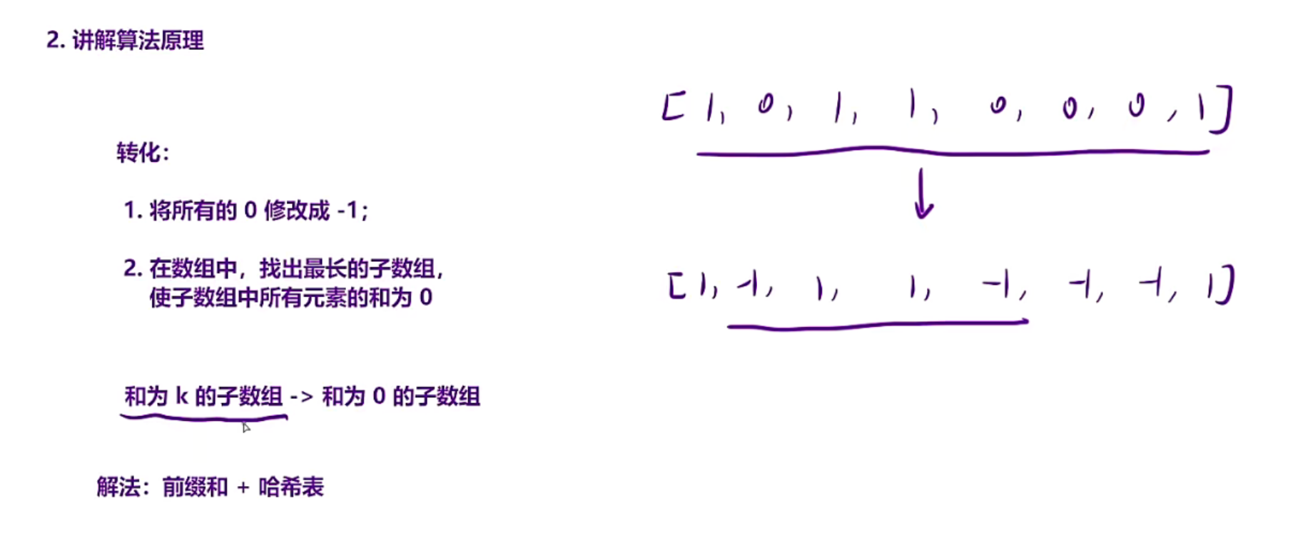 通过这一步转换,就可以把问题转换成和为0的子数组,和560例题有点类似