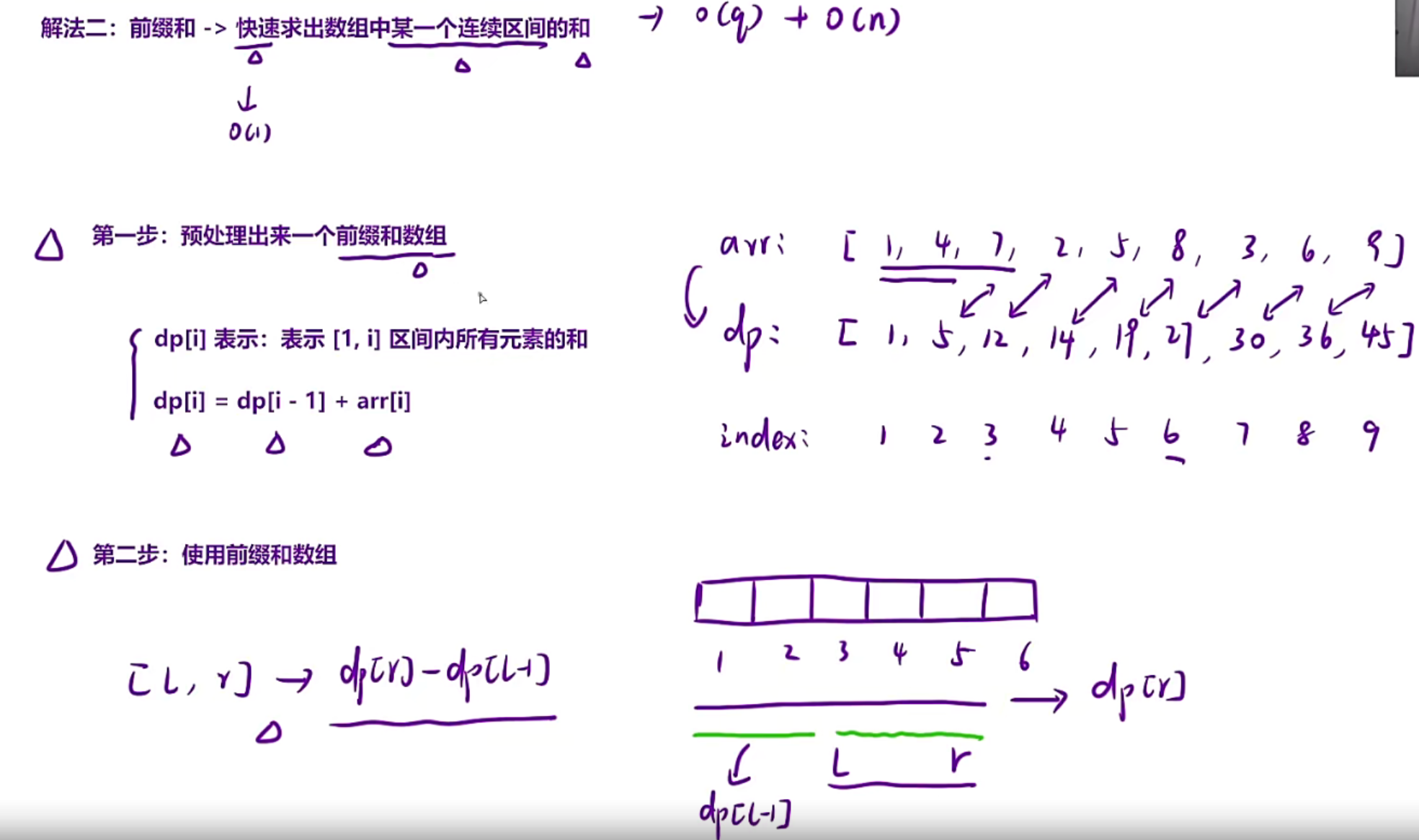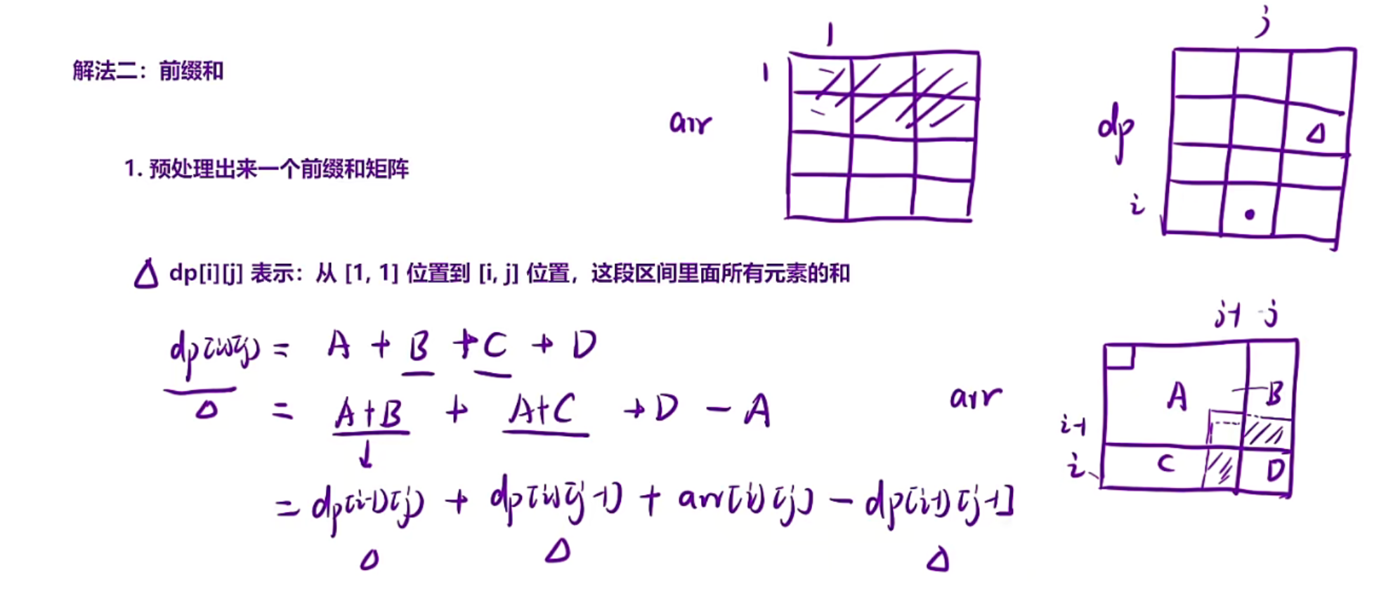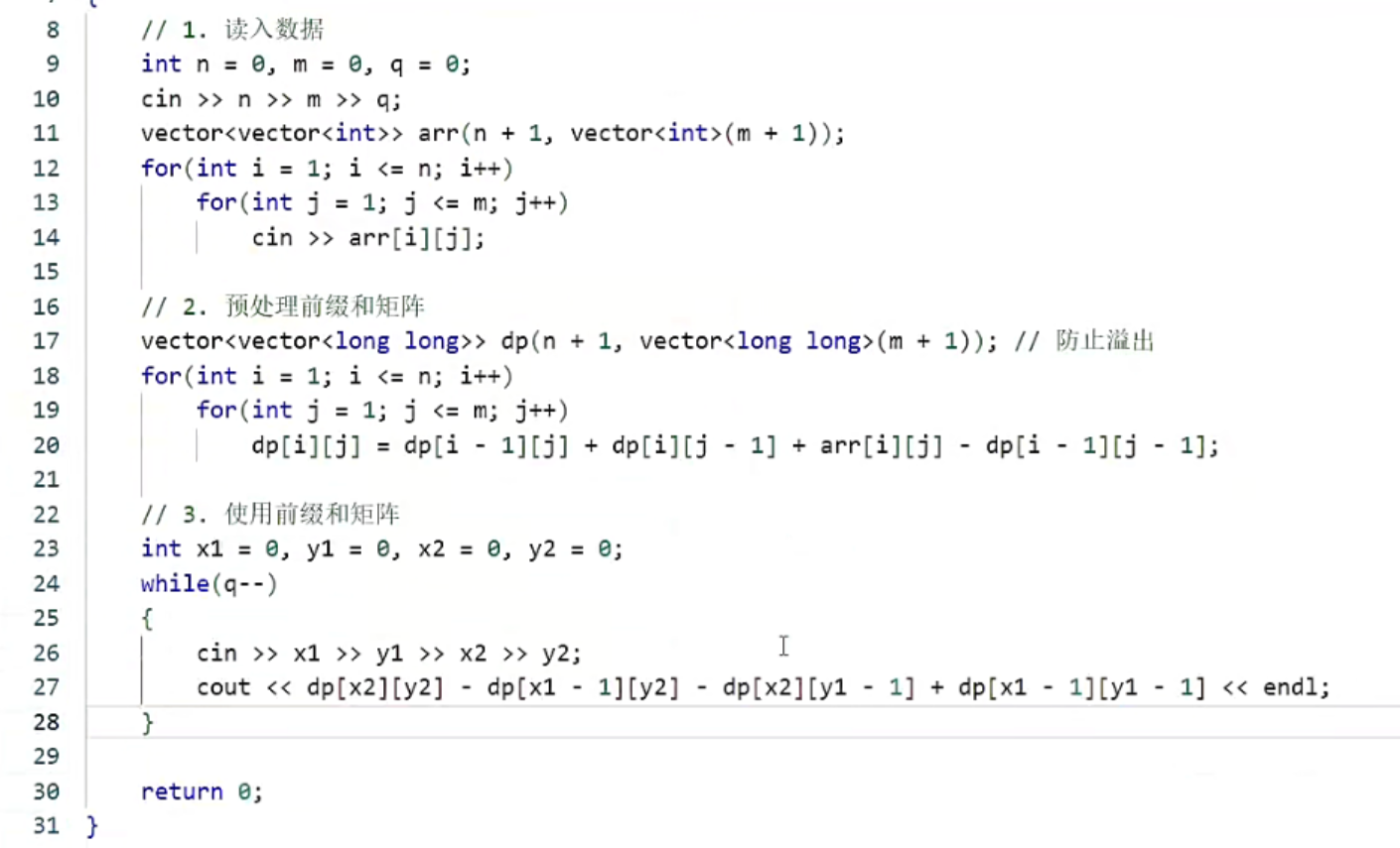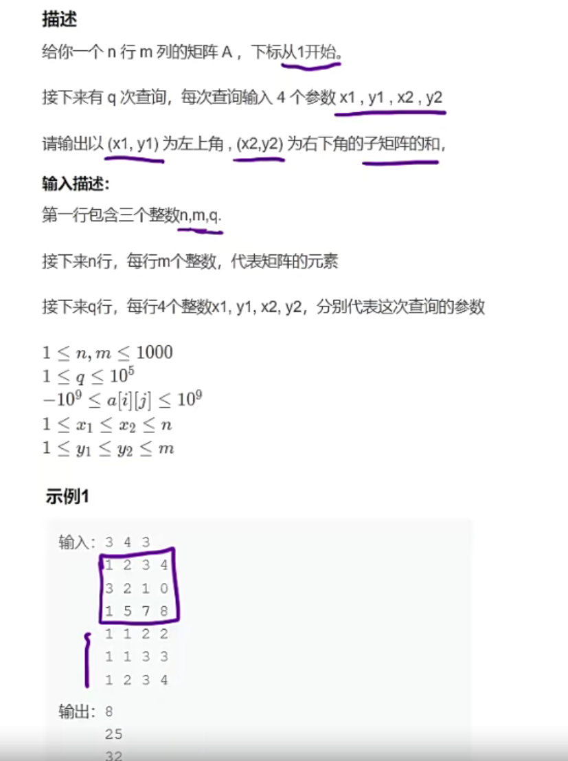 m的子数组的和 → 前缀和可 O (1) 计算每个区间和。 - 给定矩阵,多次查询任意子矩阵的和 → 二维前缀和预处理后,每次查询 O (1)。