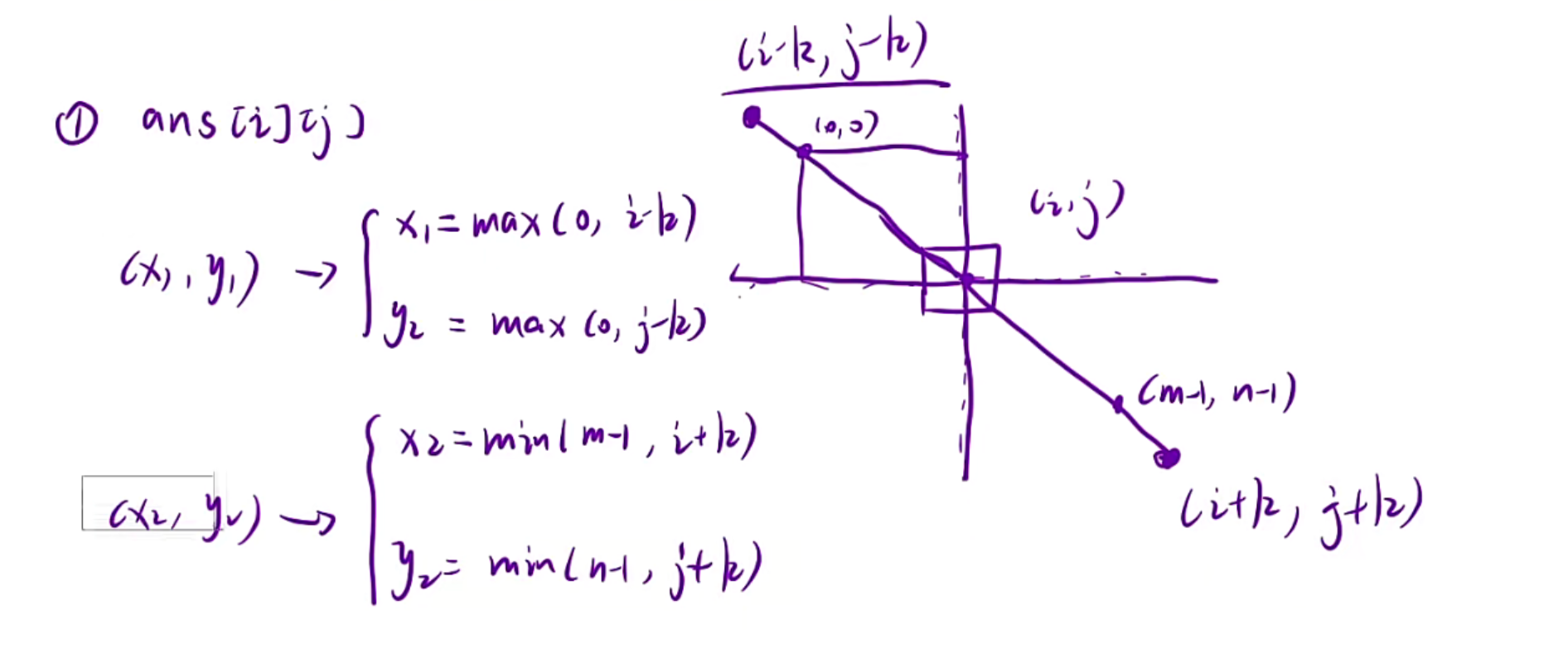 因为k代表了向四周扩展多少个格子,所以我们求左上角和右下角的坐标时就是原点+-k