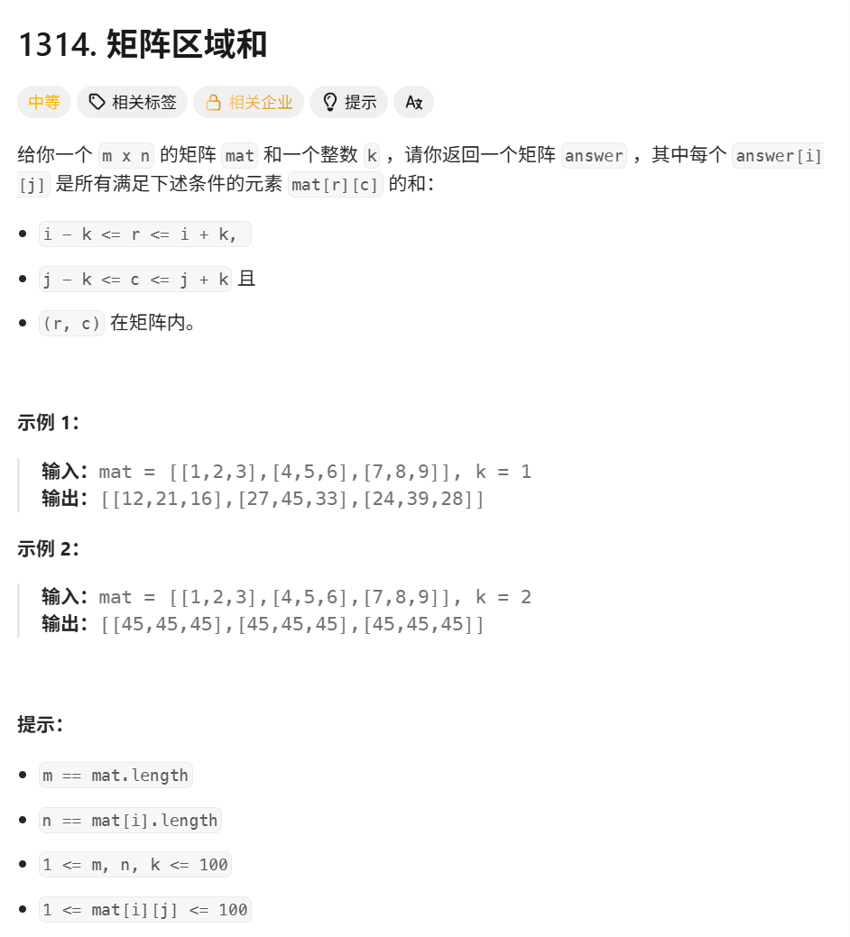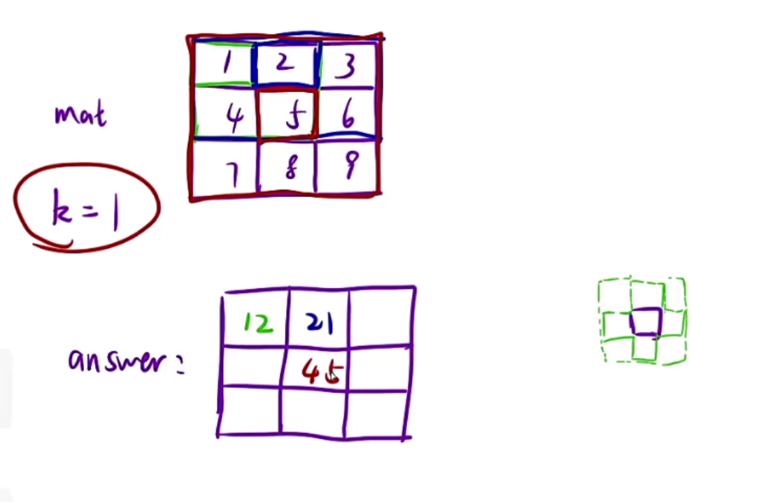 给一个矩阵mat和一个整数k,你要返回的矩阵大小和mat一样,k是告诉你算answer的时候应该怎么算