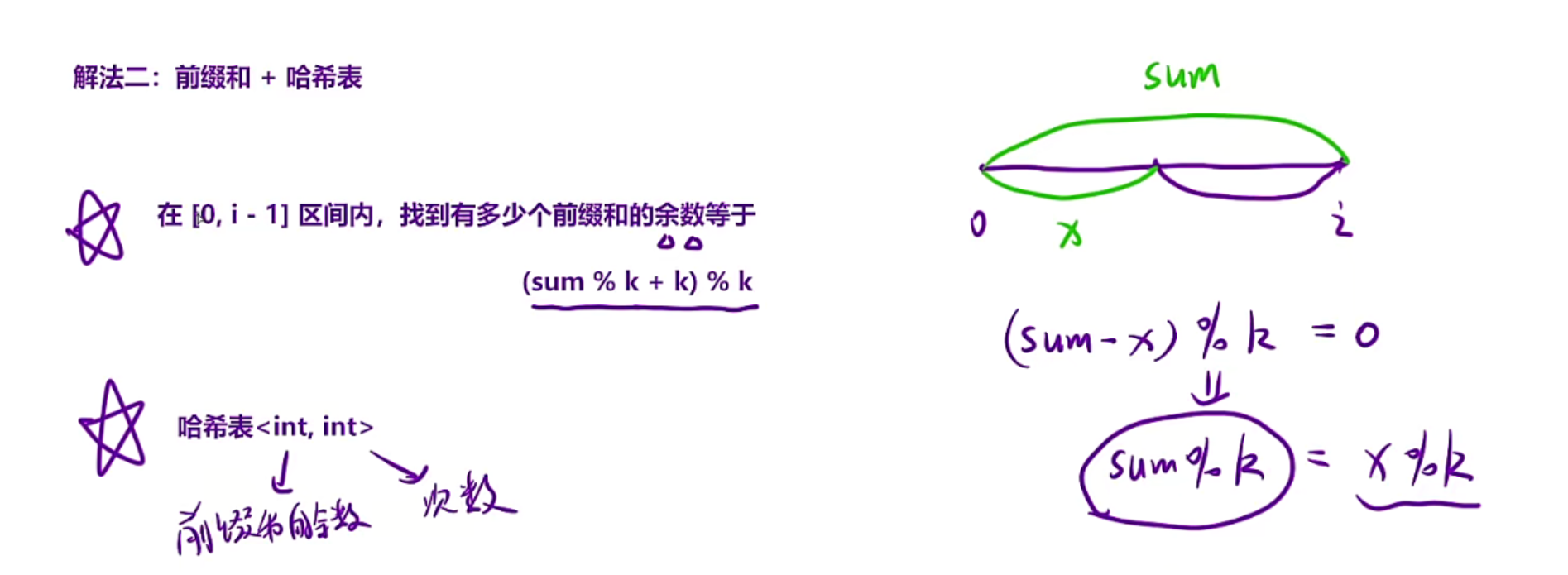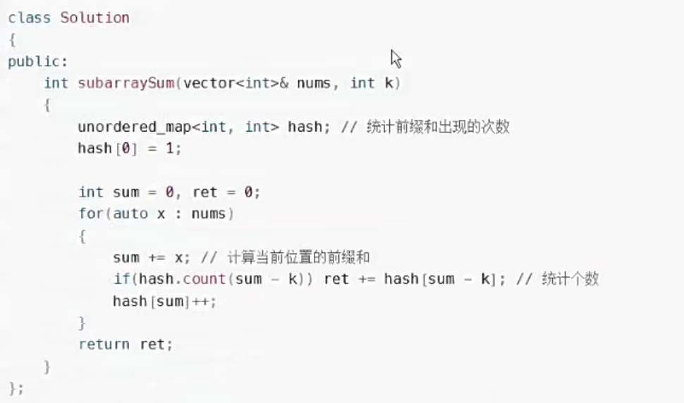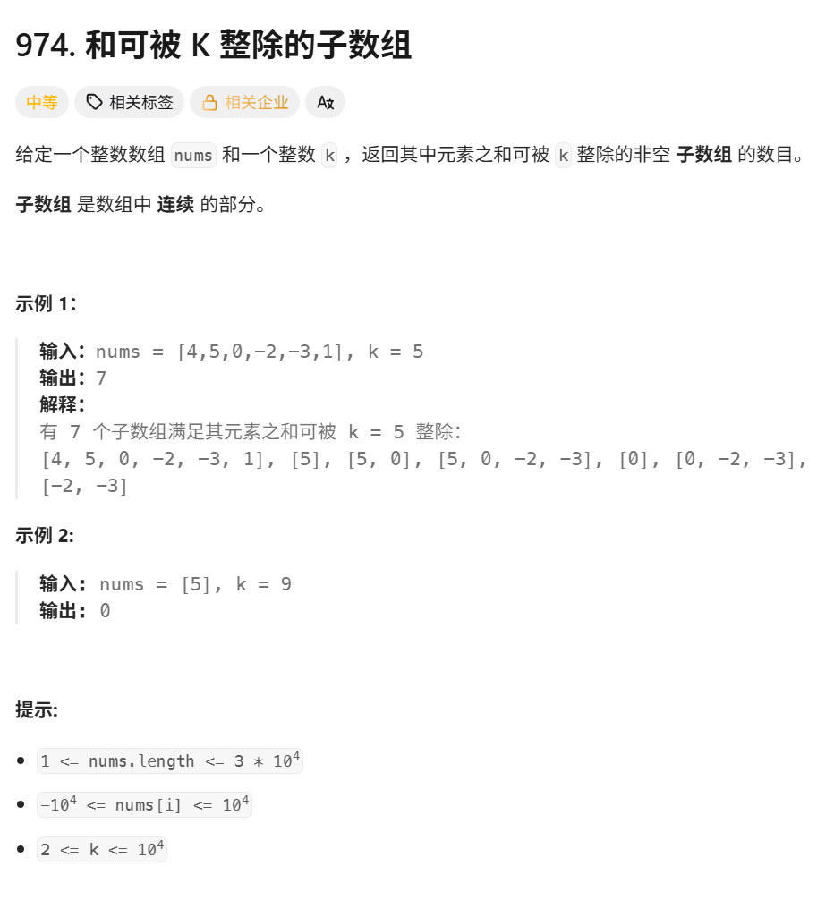 public:int subarraysDivByK(vector<int>& nums, int k) {unordered_map<int,int>hash;hash[0]=1;//细节问题int sum=0,ret=0;for(auto x:nums){//计算前缀和的余数sum+=x;ret+=hash[(sum%k+k)%k];//计算余数,并且在hash当中寻找有多少个//更新hashhash[((sum%k+k)%k)]++;}return ret;}