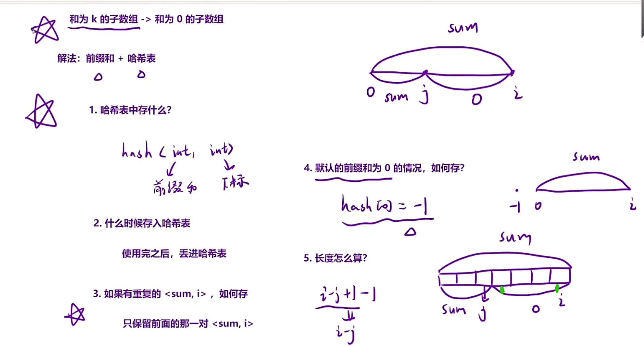 假设前面j位置我们找到一个sum,hash[sum]=j,那此时的长度应该是i-j