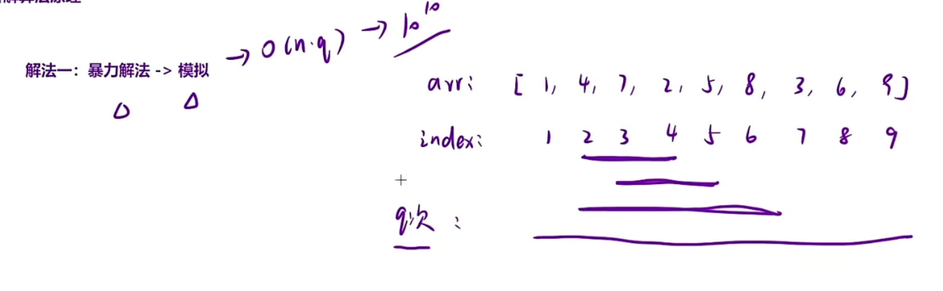 时间复杂度O(qN),但是题目当中nq的取值范围一样,如果都是最大,那时间复杂度会变为10^10,如果使用暴力解法这道题是会超时的